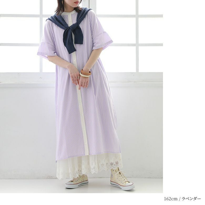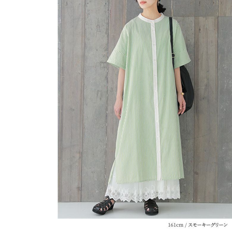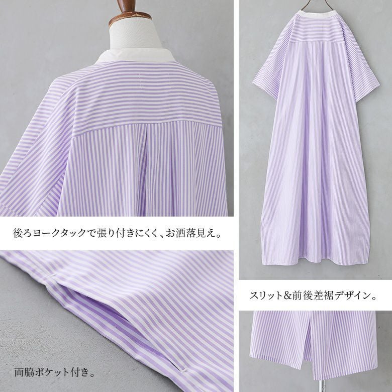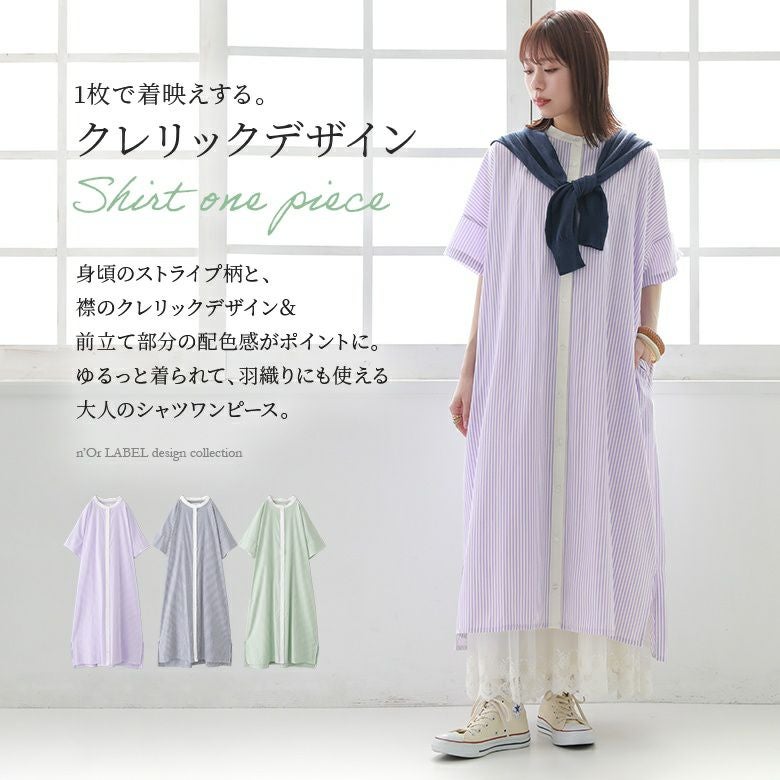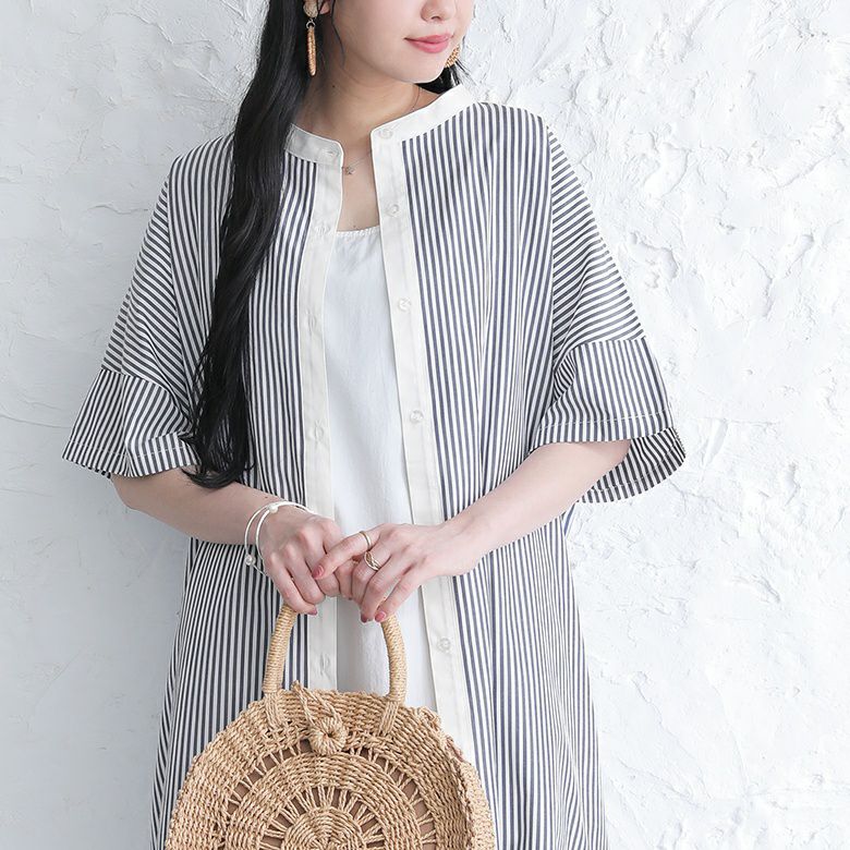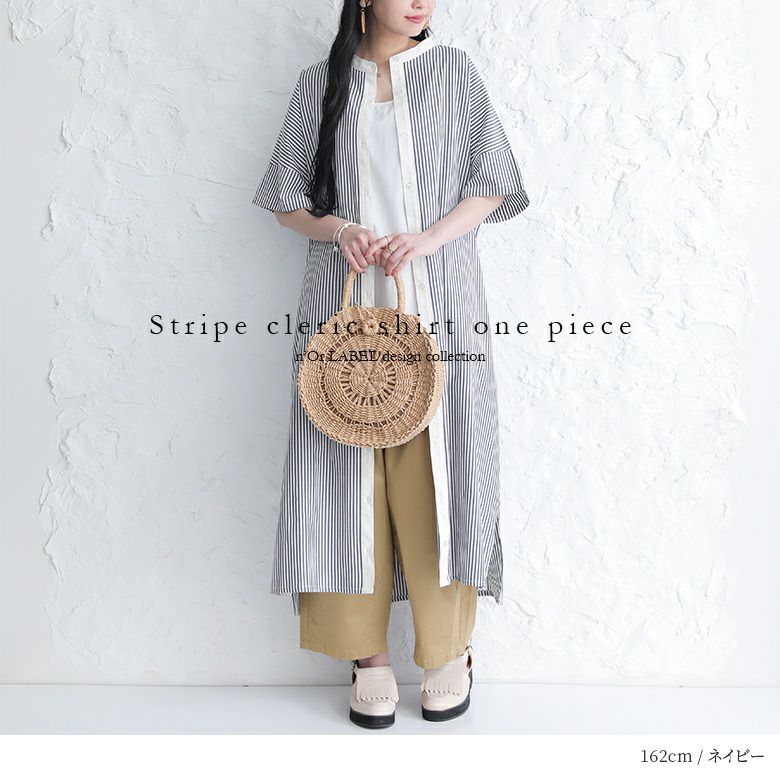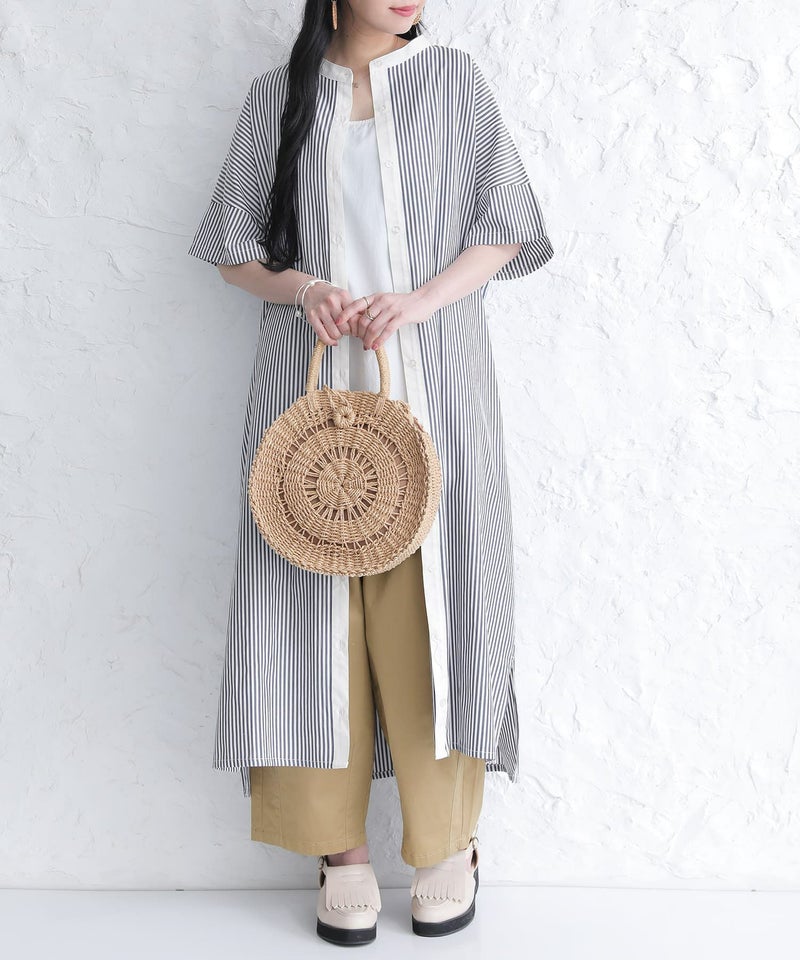身頃のストライプ柄と、襟のクレリックデザイン&前立て部分の配色がお洒落のポイント。ゆるっと着られて、羽織にも使える大人のシャツワンピースです。