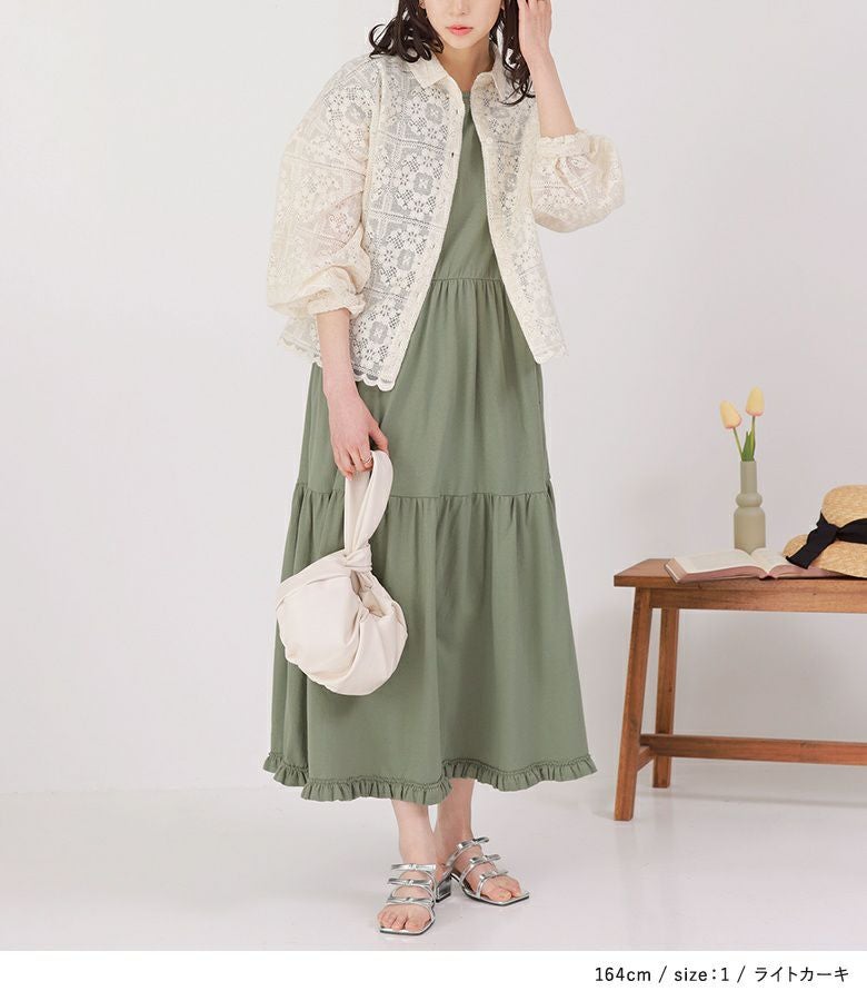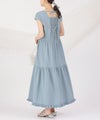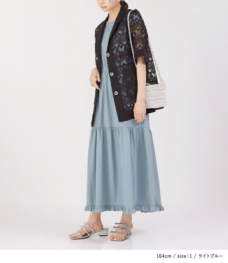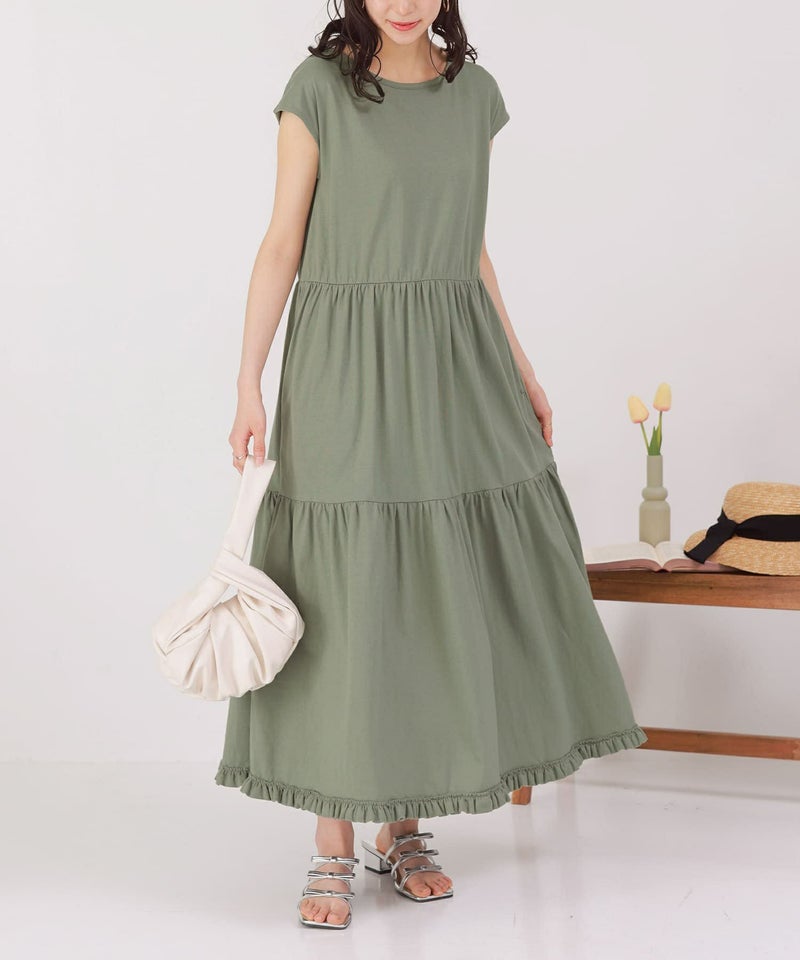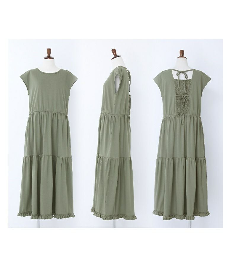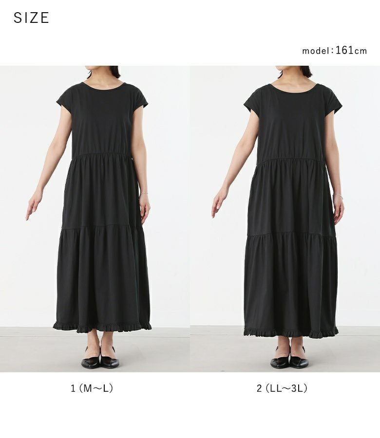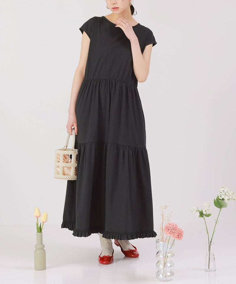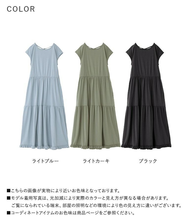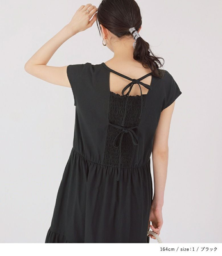 ■デザイン バックのリボンとシャーリングデザインがお洒落なワンピース。ティアードの切り替えが華やかさをプラスし、マキシ丈で大人っぽく着用できる一枚。裾は共布でフリルをあしらってポイントに。フレンチスリーブで肩先や腕を程良くカバーします。ウエストは裏から細めの平ゴムを付けているため、伸縮性があり着脱もしやすい仕様。