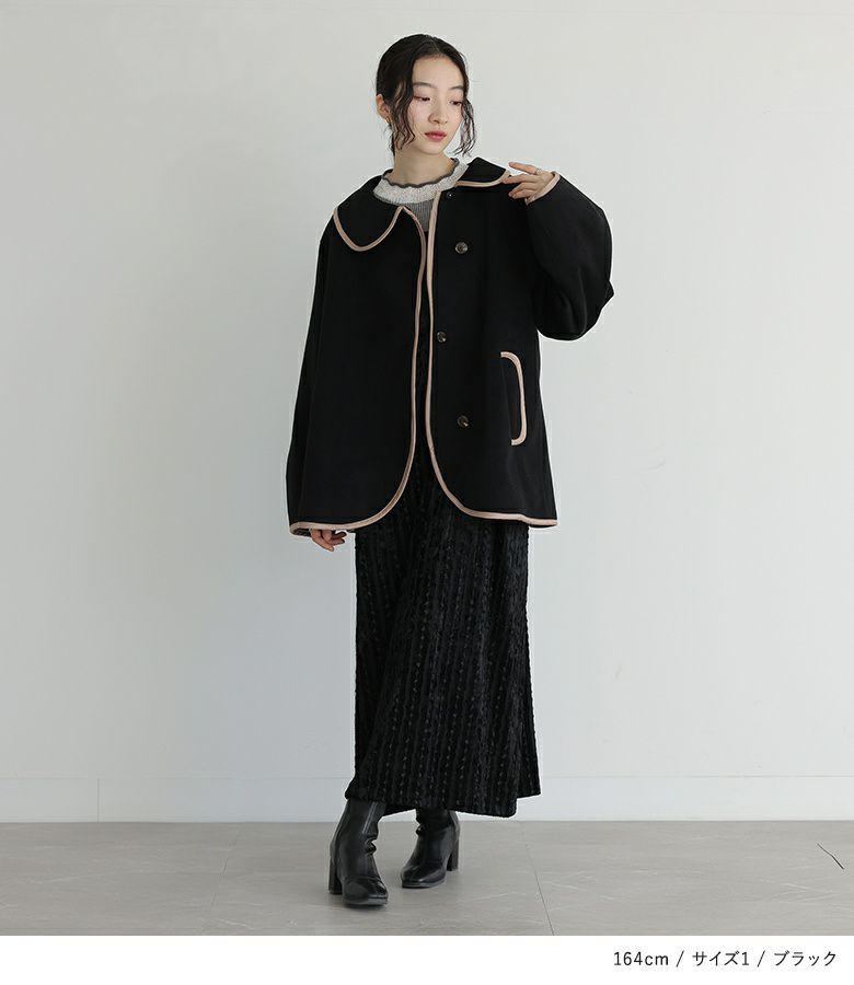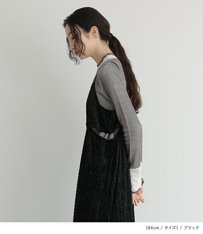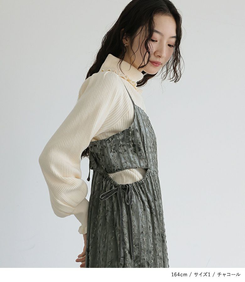 肩紐が15cm余るくらいで着用。すっきり見えるシルエットで着やせが叶います。生地も秋冬らしく、着回しもできそうです。