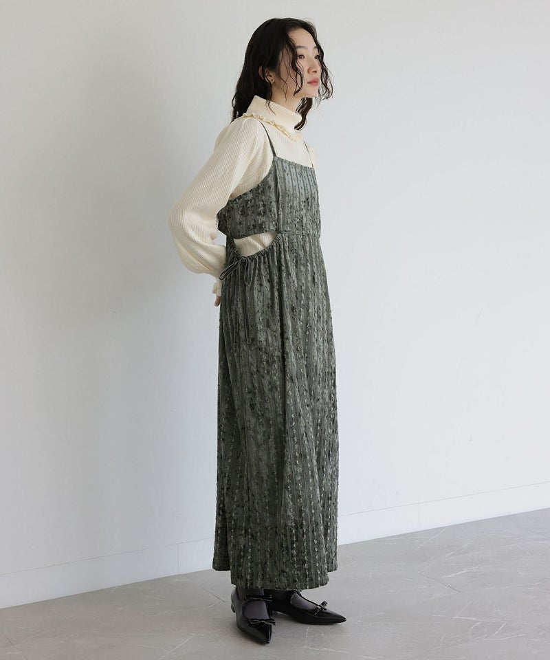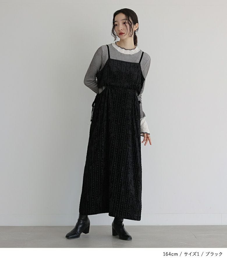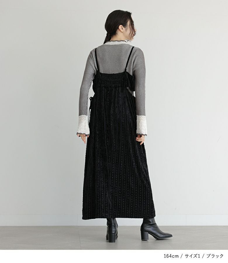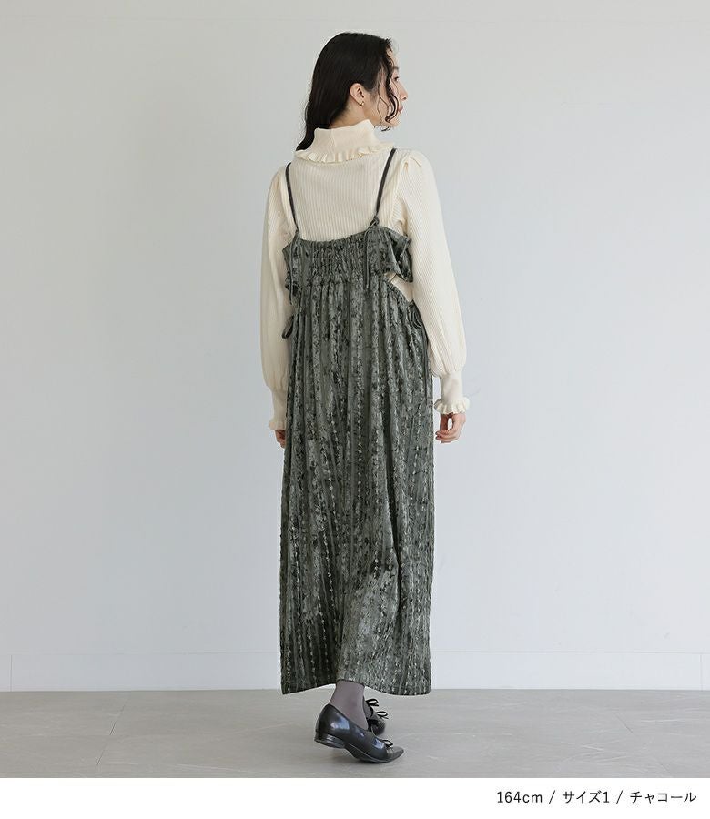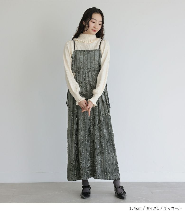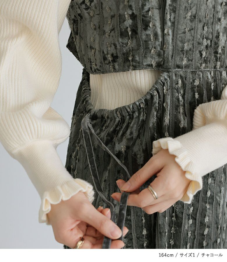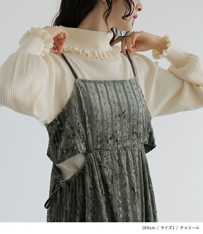 肩紐が15cm余るくらいで着用。すっきり見えるシルエットで着やせが叶います。生地も秋冬らしく、着回しもできそうです。