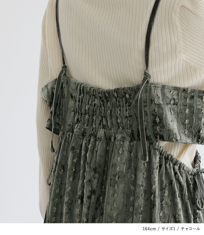 肩ひも約32cmでちょうどくるぶしぐらいの長さでした。リボンでウエストを調節できるので、ゆったり着られますが、スッキリ見えます。