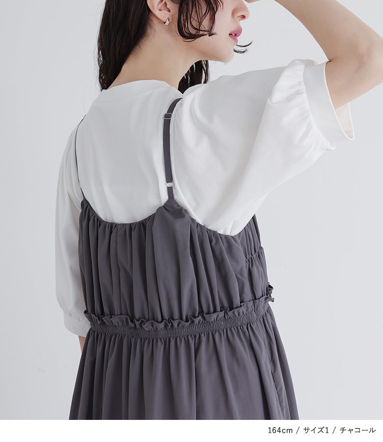 アジャスターを肩部分にして着用。胸元から脇下にかけてゆったりとしています。