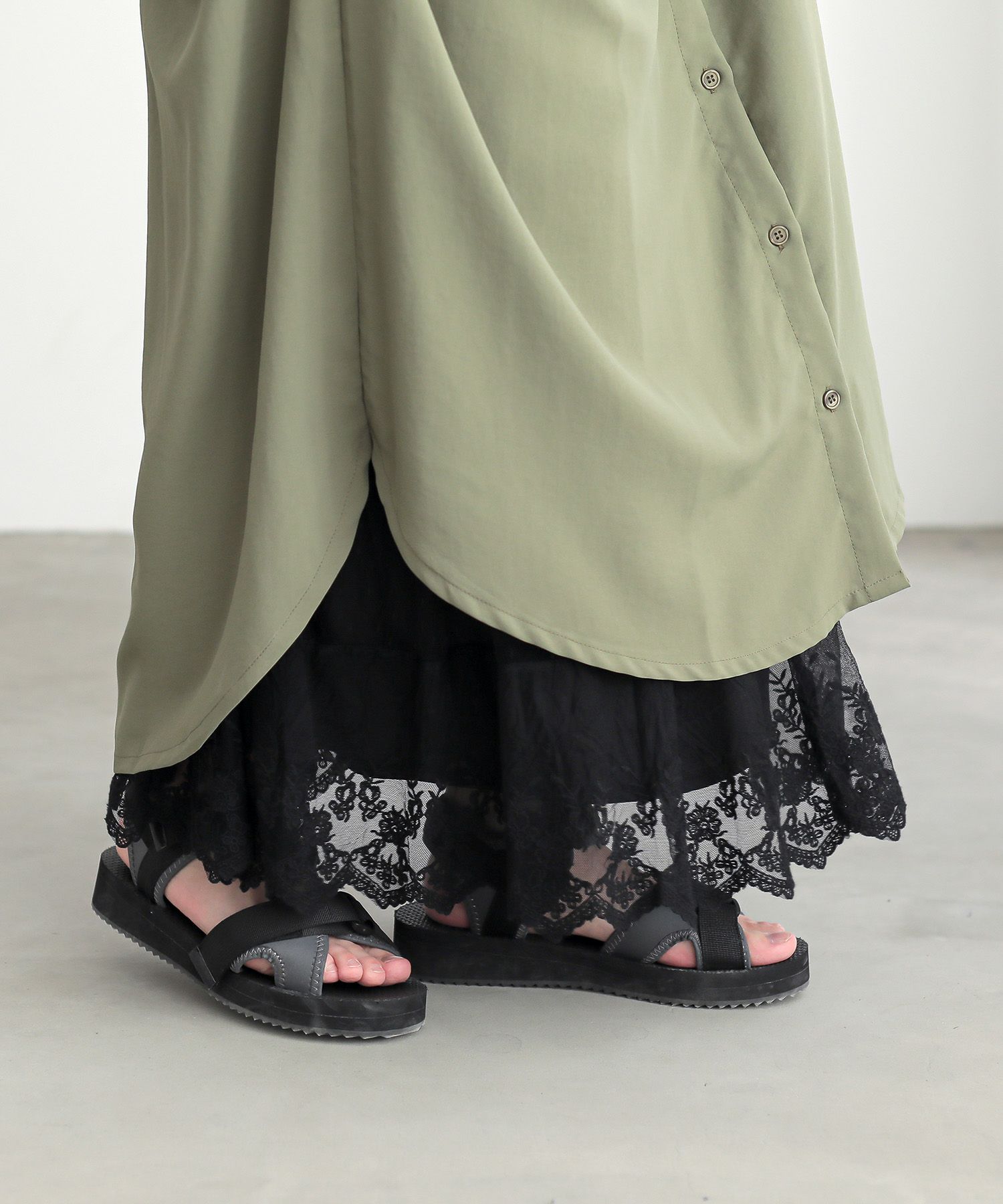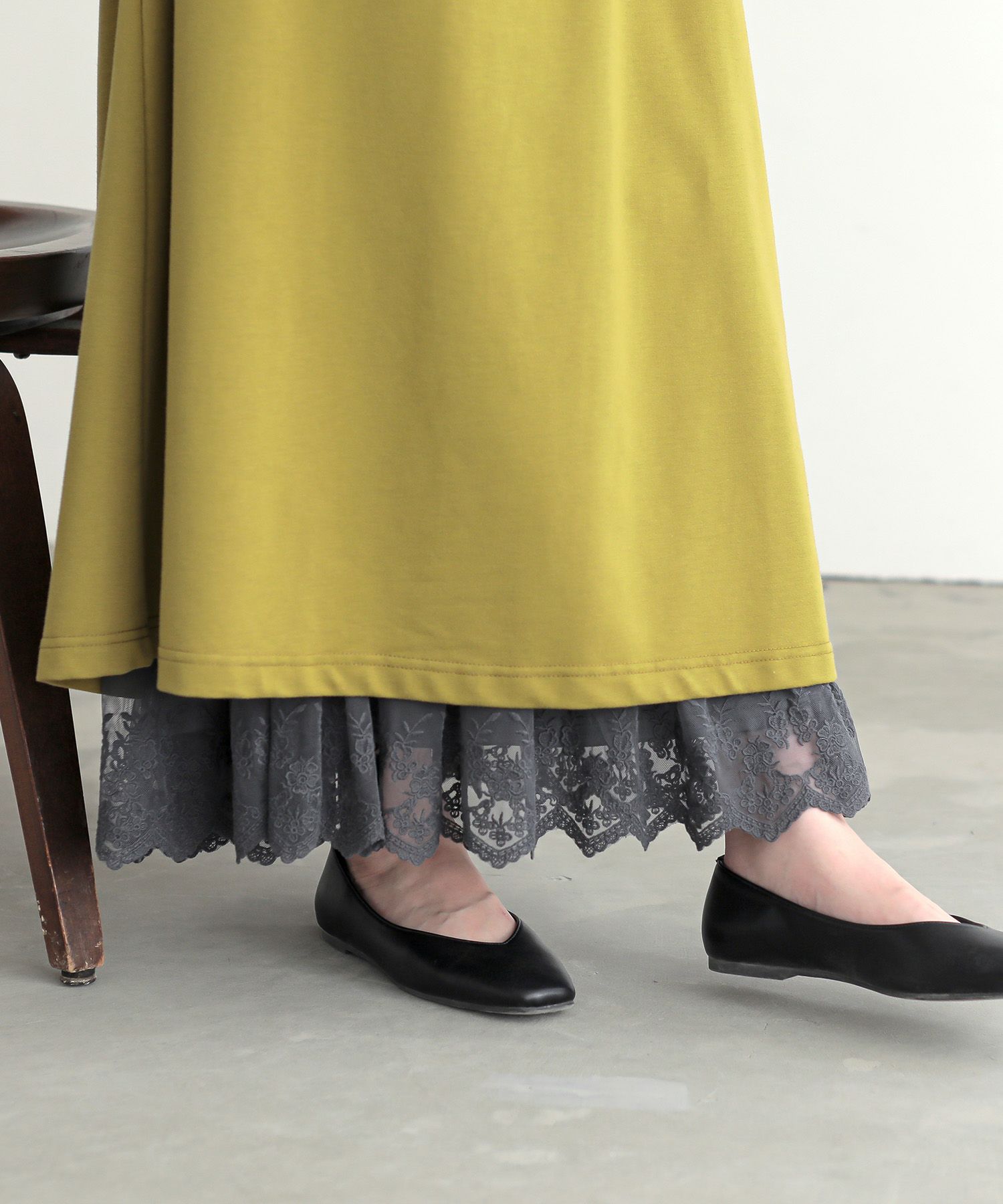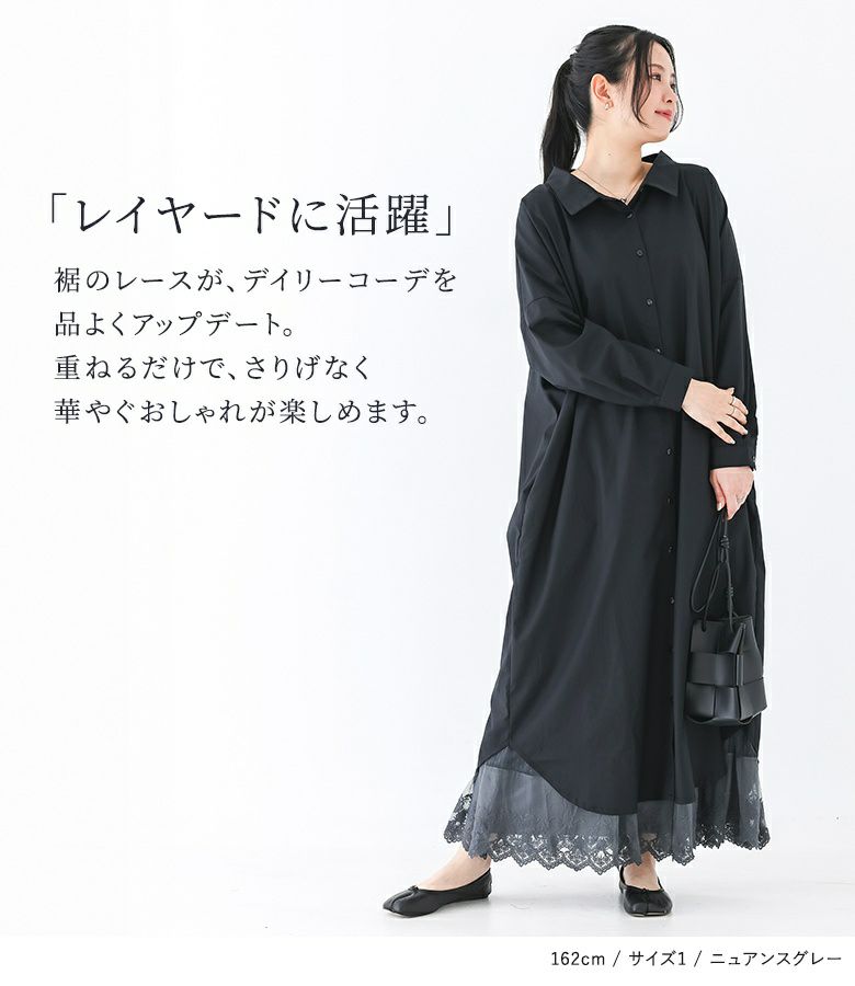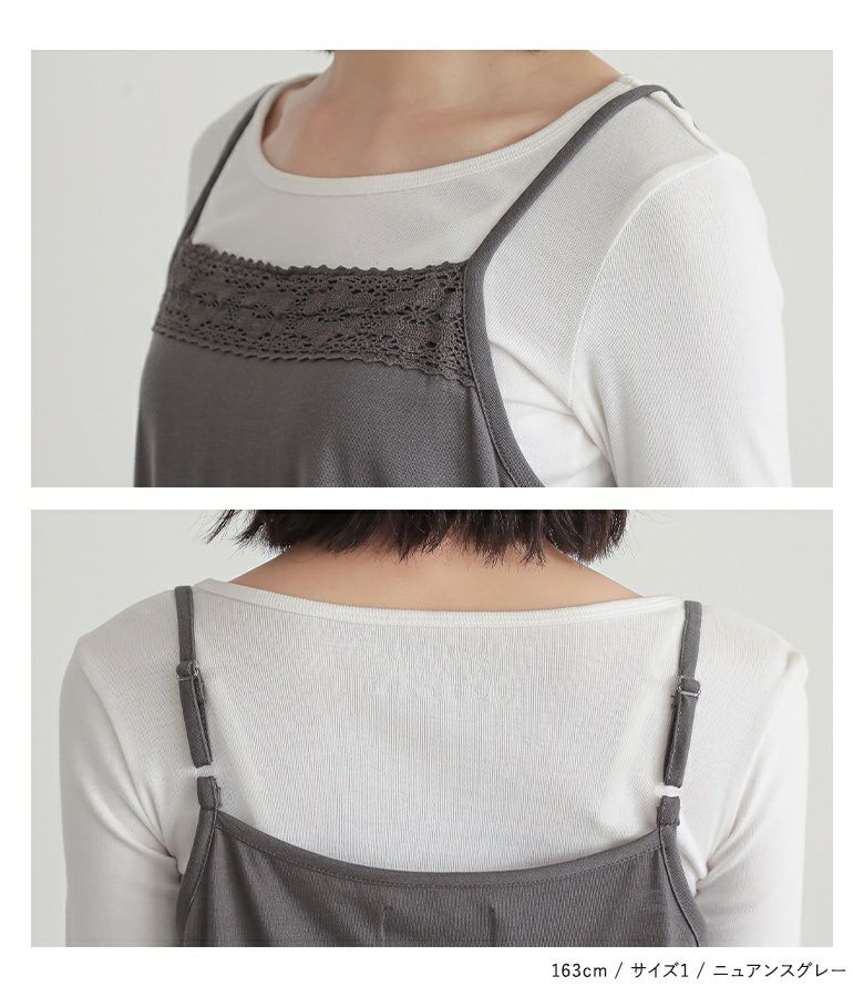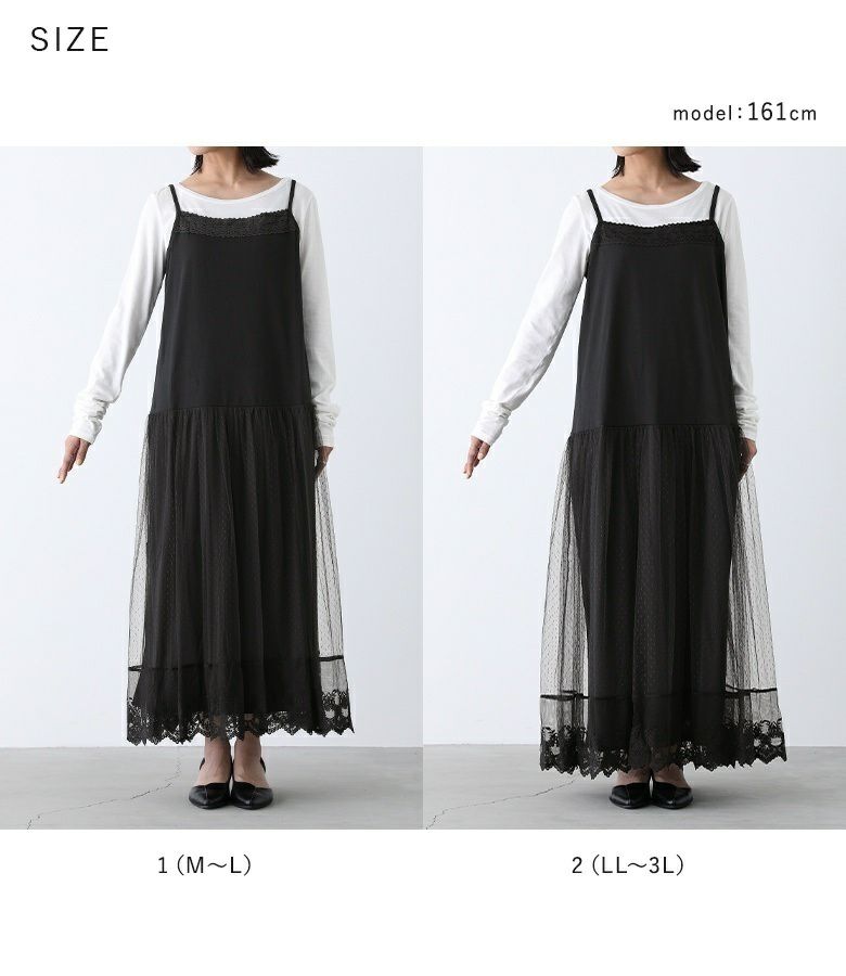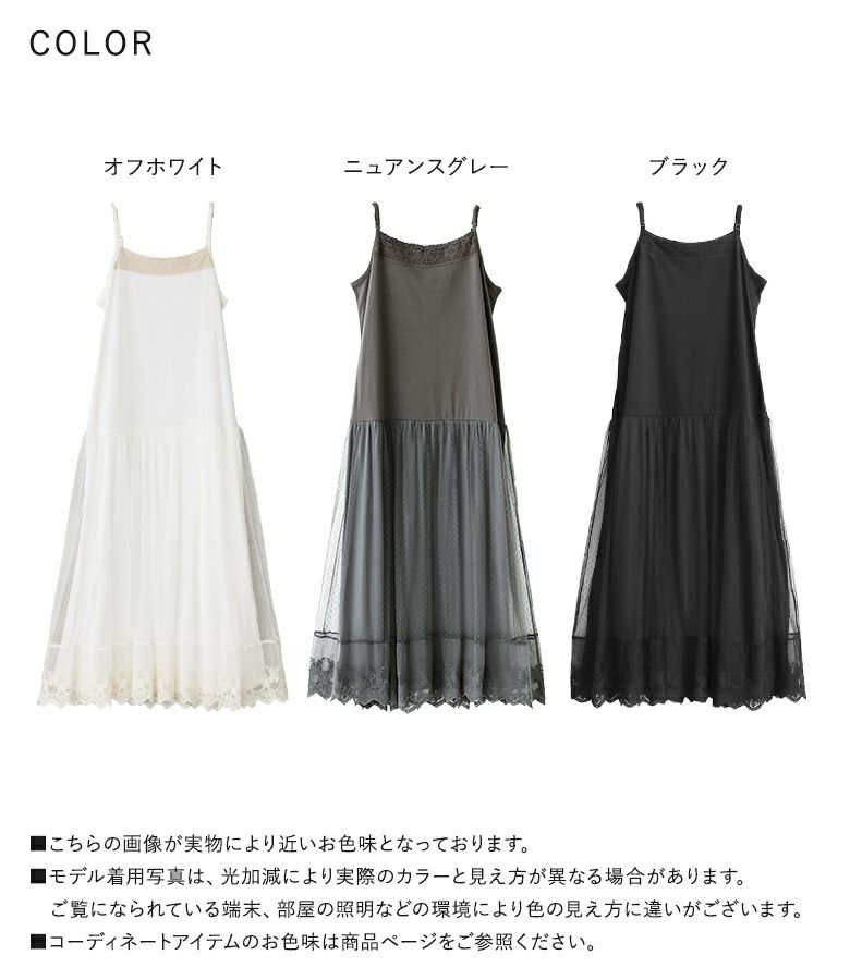 お手持ちのワンピースの下に重ねて、裾からちらっとレースを覗かせたレイヤードコーデをお楽しみいただけます。Tシャツなどトップスの上に重ねて、キャミワンピースとしても着回していただけます。