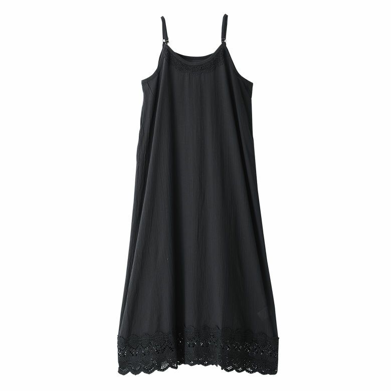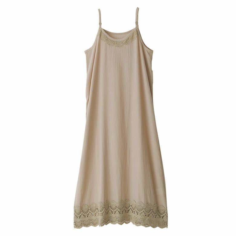 肩ひもは、アジャスターで調整可能。同素材の紐付きでブラウジングも楽しめる。さりげなくあしらわれた胸元のレース。透け感が上品な裾レース。