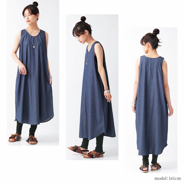 デニム風によくある例のニオイはもれなくありました。とりあえず洗濯ですね。 薄くて軽く、動きやすいワンピースです。切り返しがない服は太って見えがちですが、そんなこともなくキレイに着られるのが嬉しいです。