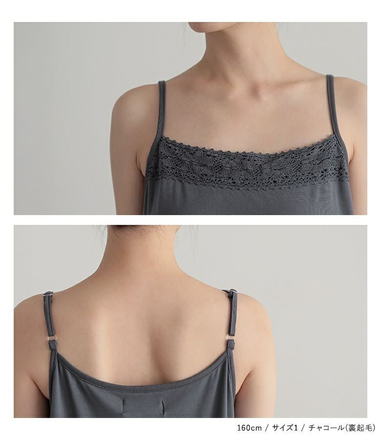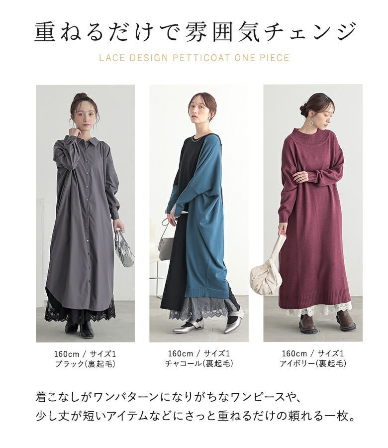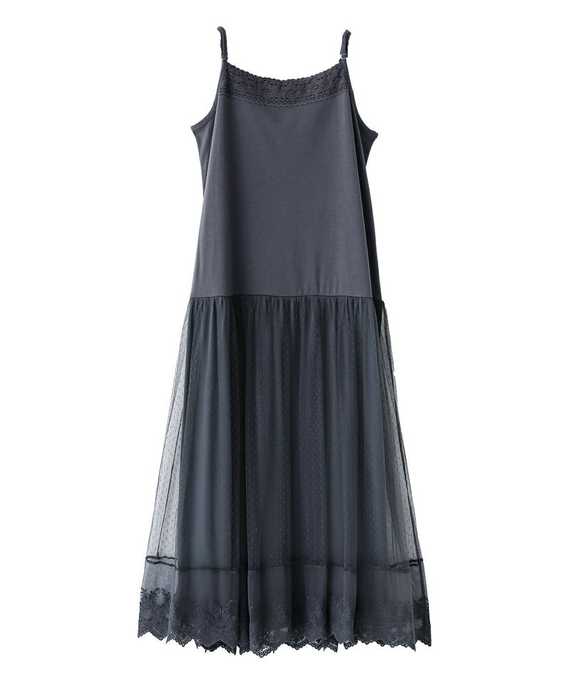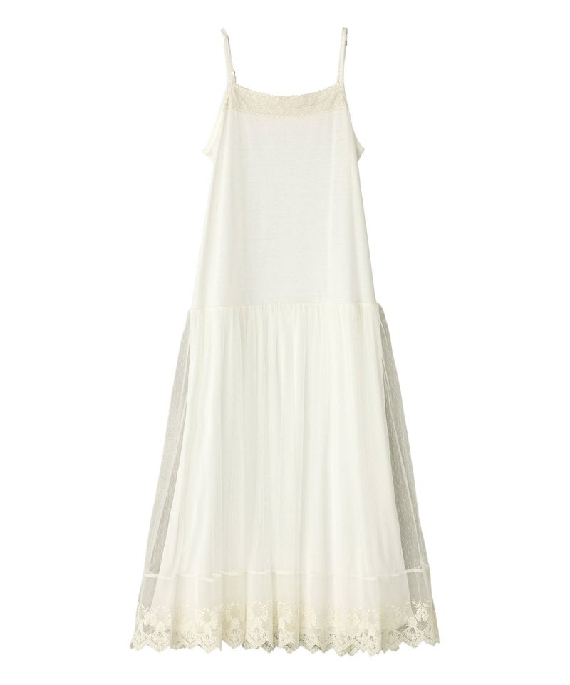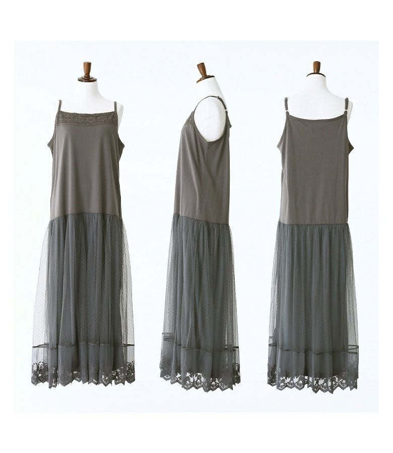 お手持ちのワンピースの下に重ねて、裾からちらっとレースを覗かせたレイヤードコーデをお楽しみいただけます。Tシャツなどトップスの上に重ねて、キャミワンピースとしても着回していただけます。