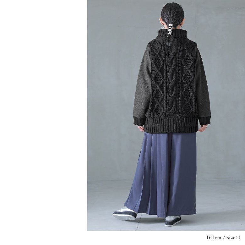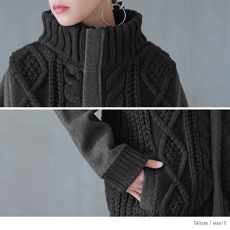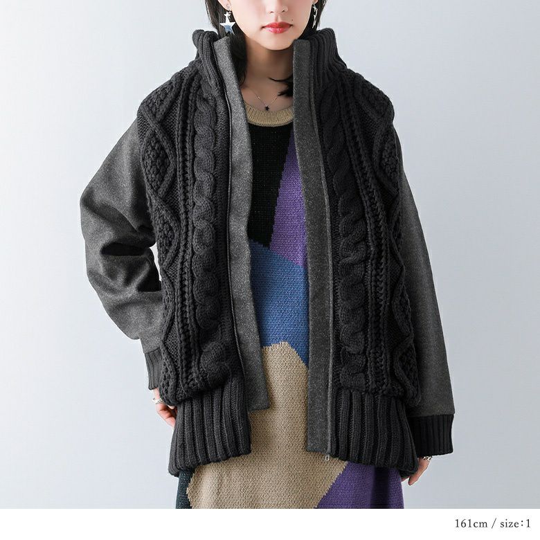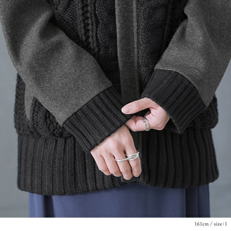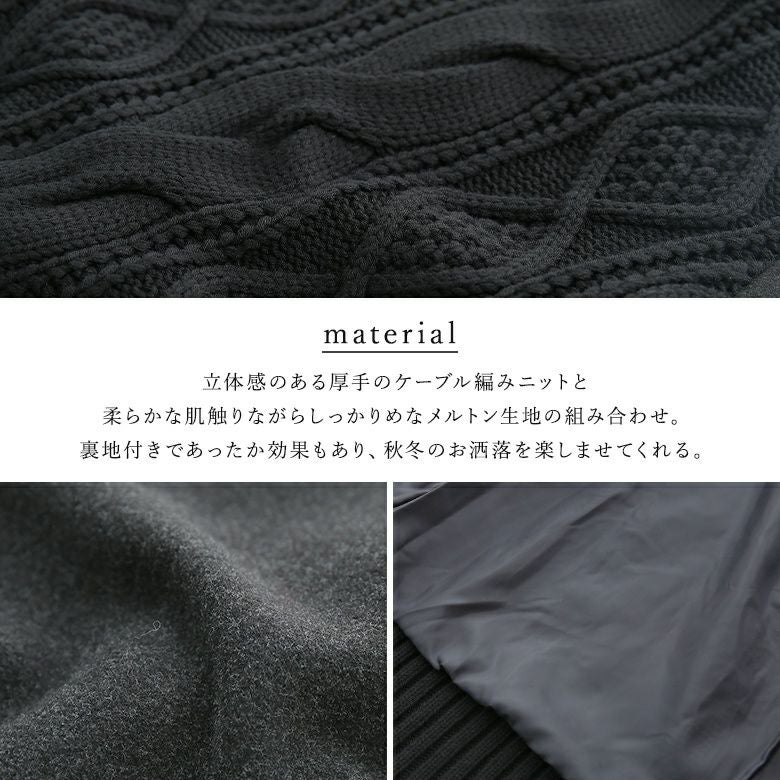 甘くなりすぎない、立体感のあるケーブル編みニット。柔らかだけどしっかりしたメルトン生地との異素材MIXで、格別のお洒落を楽しめます。