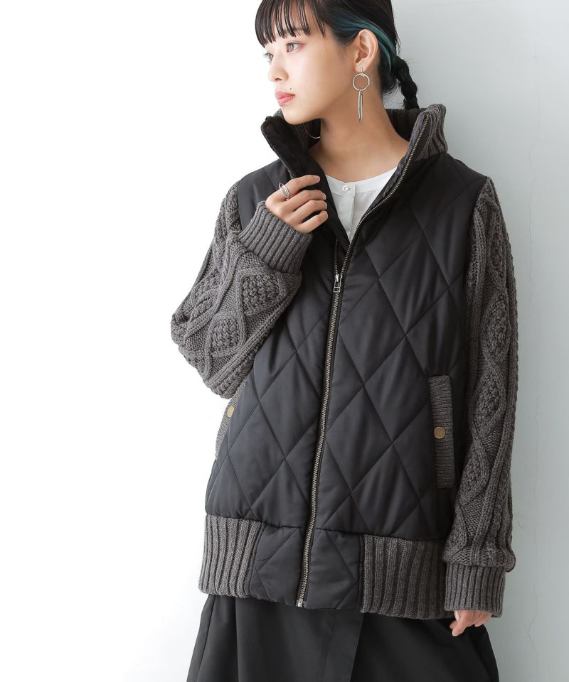 光沢感を抑えたキルティング×立体的なケーブルニットのモード感高まる組み合わせ。