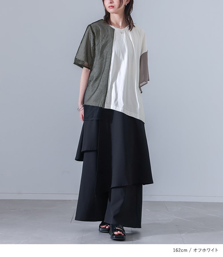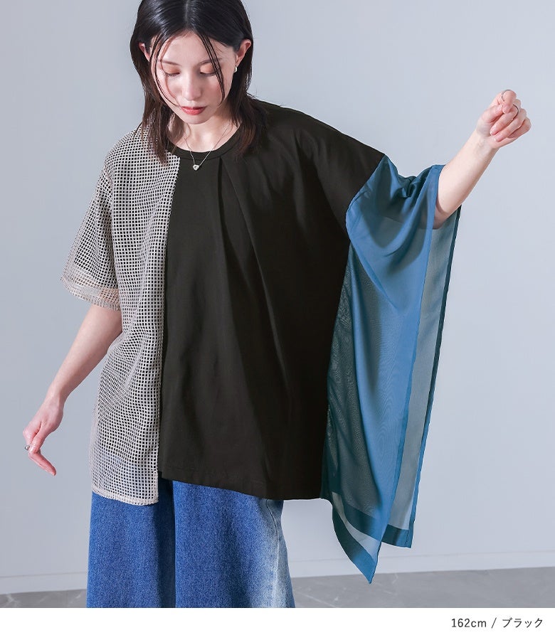 襟ぐり前中心から少しずらしたタックを施し、右袖にはメッシュ生地とカットソー生地を重ね、左袖はシフォン生地に切り替えた、アシンメトリーデザインです。