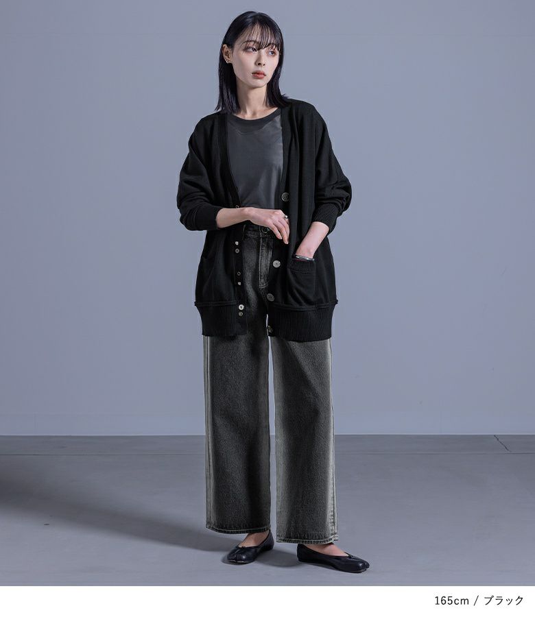 ボタンデザインが効いたモードな印象のカーディガン。ボタンホールの間にフェイクボタンを配置し、着脱もしやすい仕様です。袖と裾の切り替えはニットの特性を生かしたくるんとしたデザインに。ゆるっとしたシルエットでラフに羽織れる一着です。