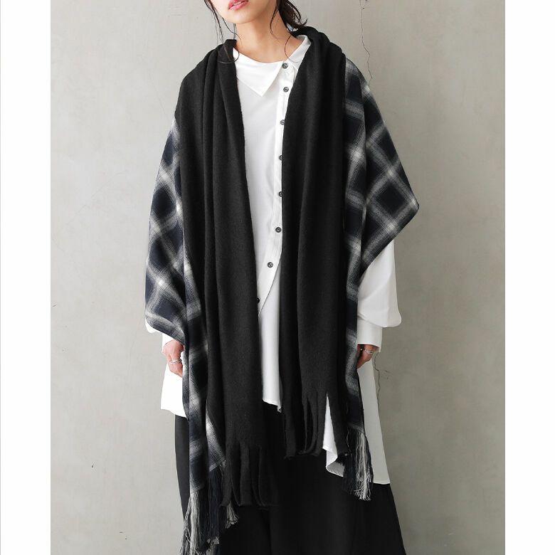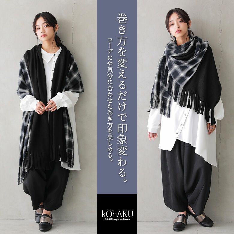 雰囲気を変えてくれる≪kOhAKU≫異素材チェックフリンジストールです。