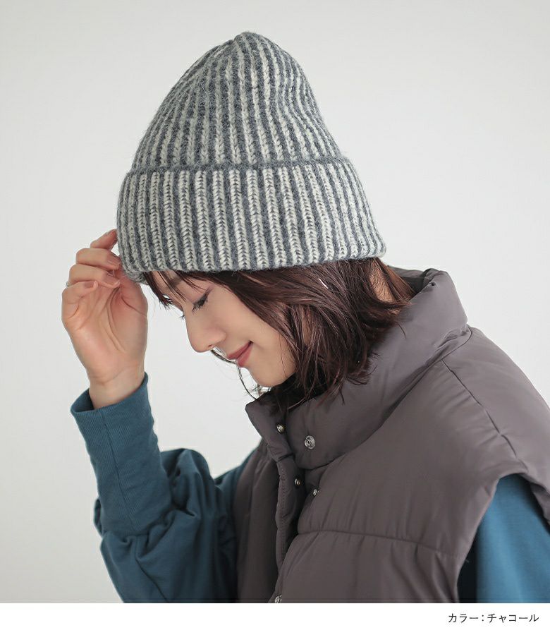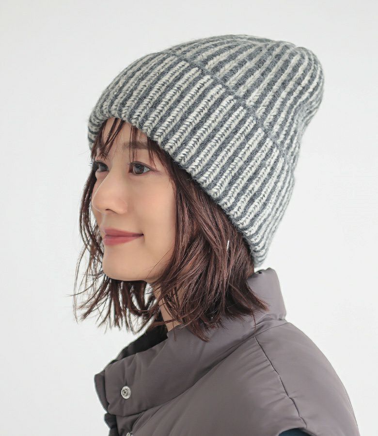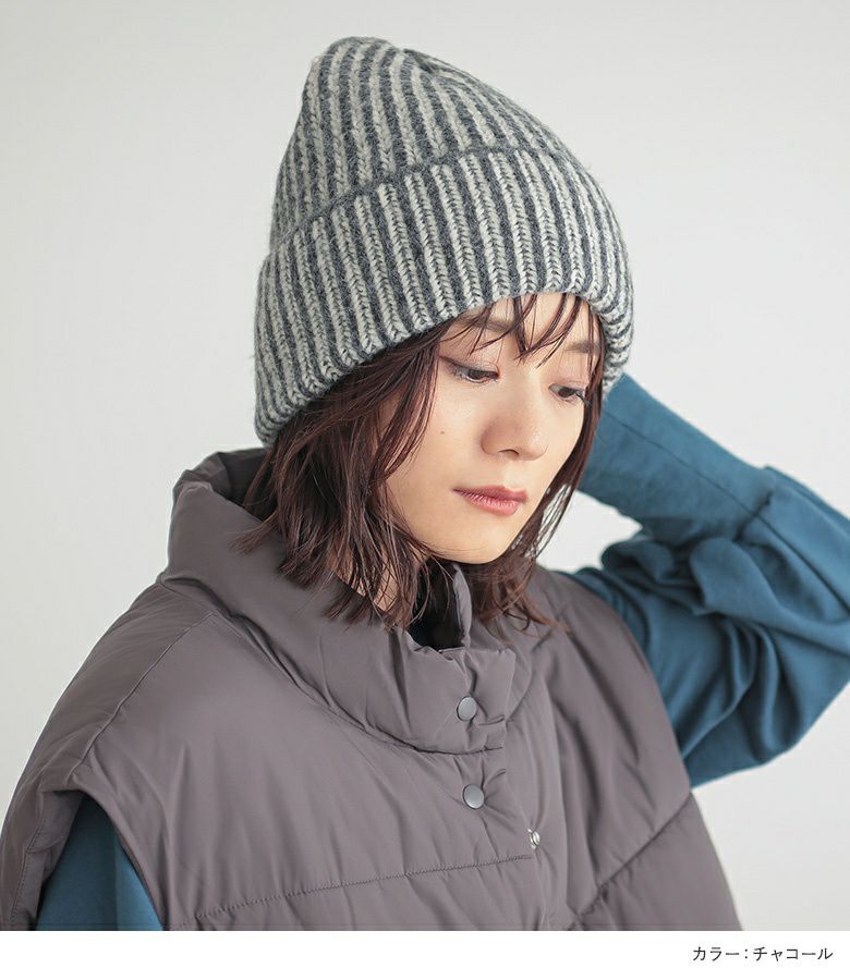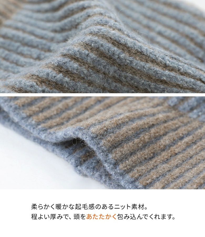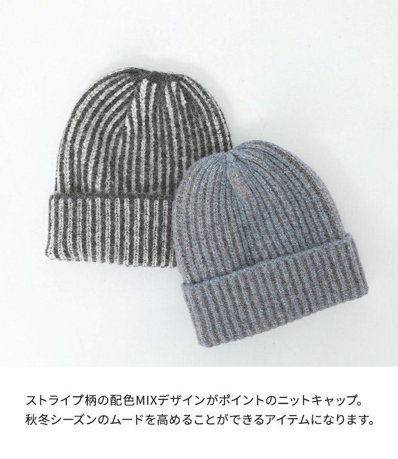 ストライプ柄の配色MIXデザインがポイントのニットキャップ。