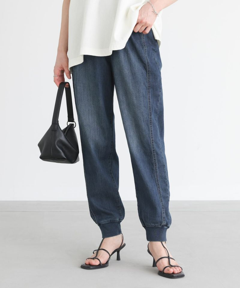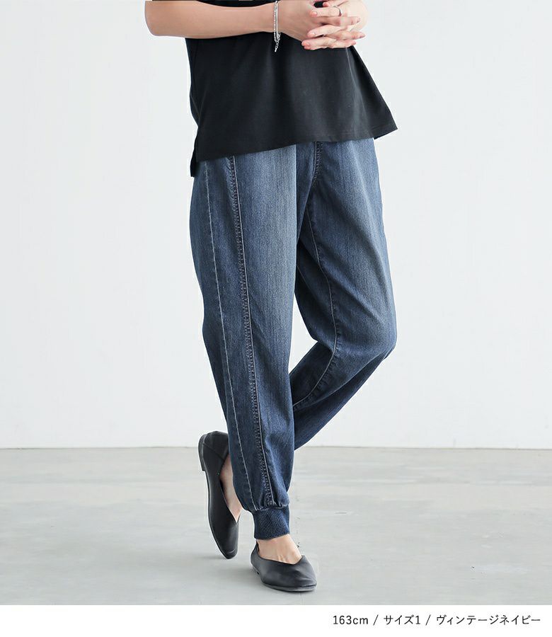 ヒップ周りはゆったりと、足首に向かって細くなるテーパードシルエットが魅力のひんやり冷感デニムジョガーパンツ。脚長効果が期待できる縦に入れたシーム切り替えと、ヴィンテージ感のあるブラスト加工がこなれ感をプラスします。足首はメリハリのあるリブデザインですっきりシルエットに。前後には便利なポケット付きです。