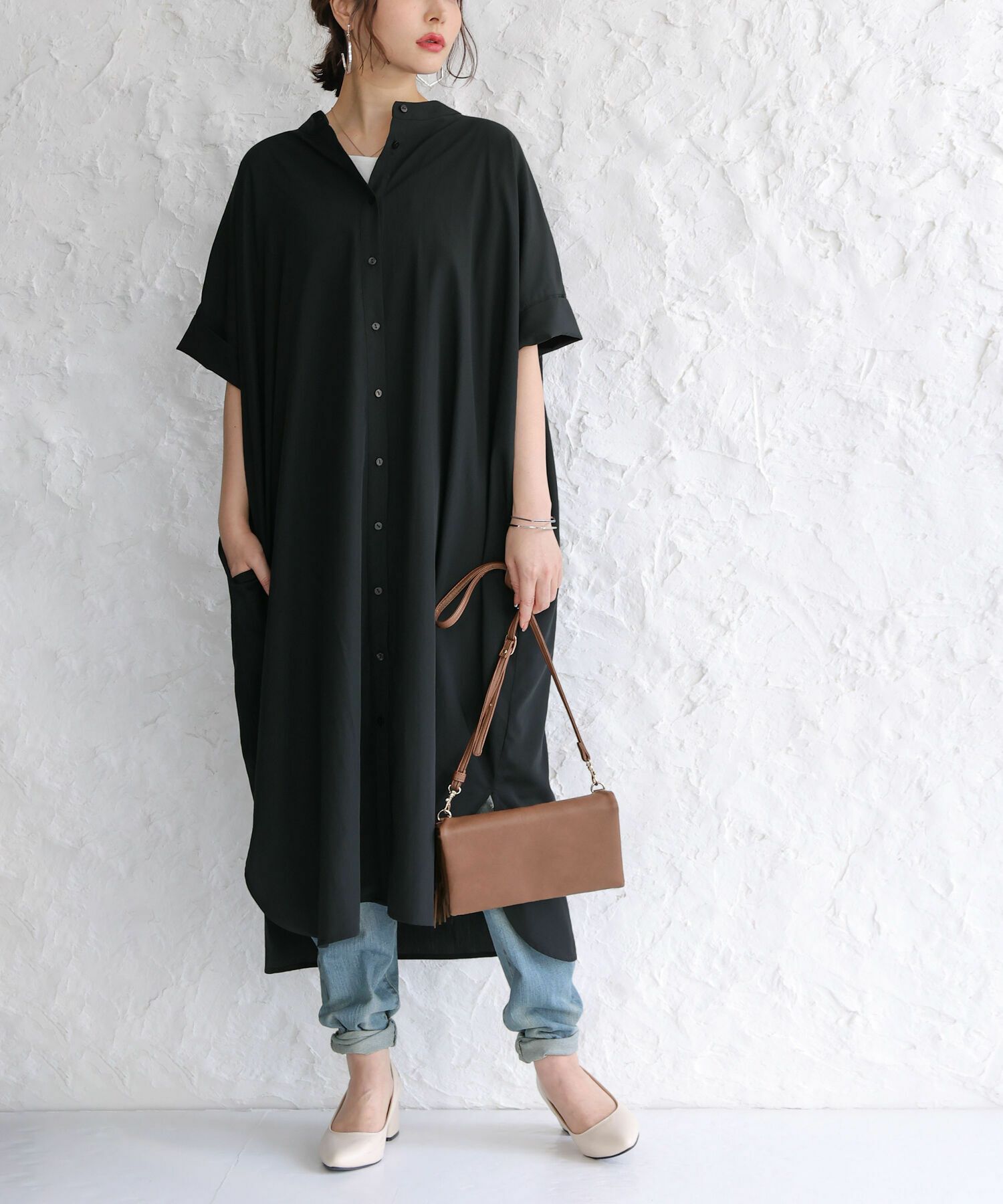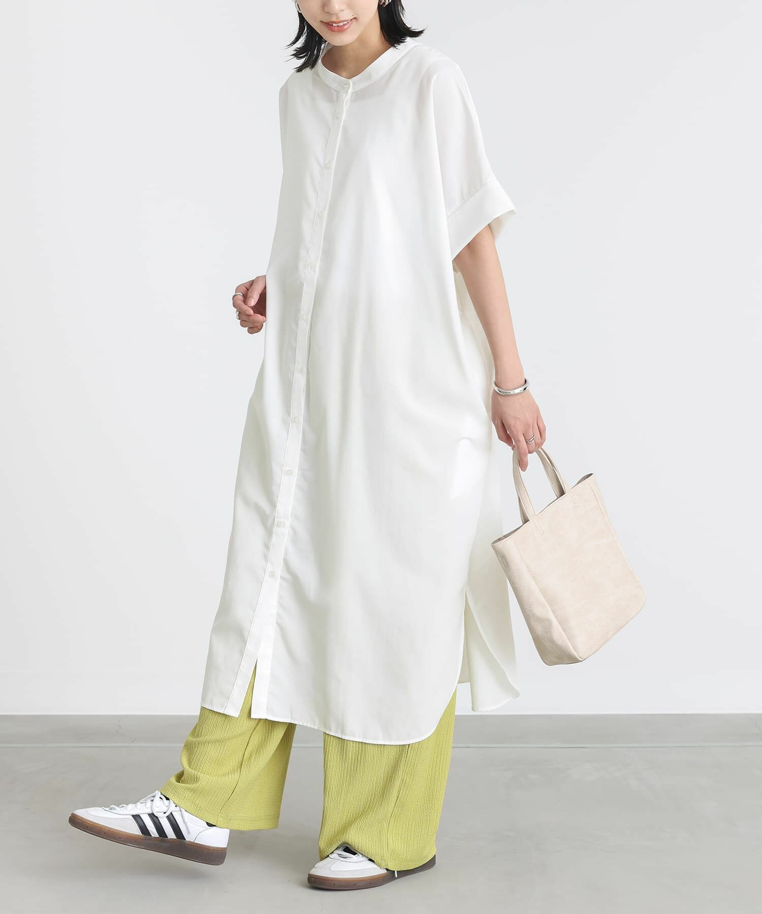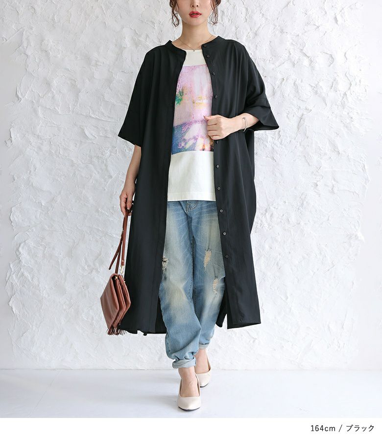 抜け感のあるバンドカラーと程良いロング丈がポイントのシャツワンピース。ボトムスと合わせて、レイヤードスタイルを楽しめる一枚です。袖口は折り返して丈感のアレンジが可能。両サイドにはポケット付きです。