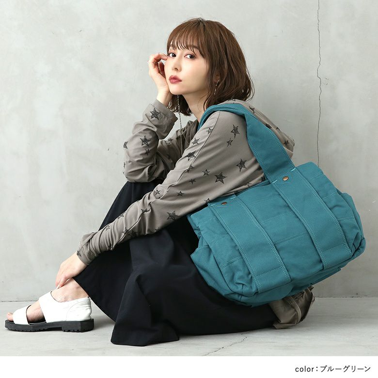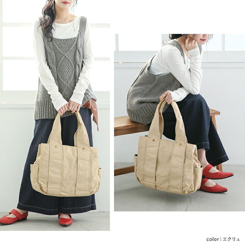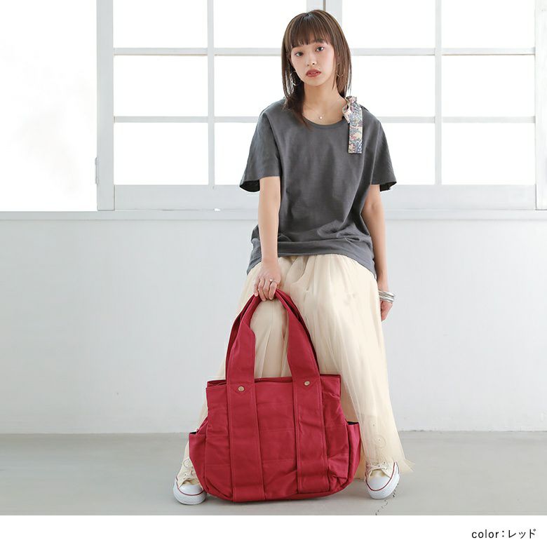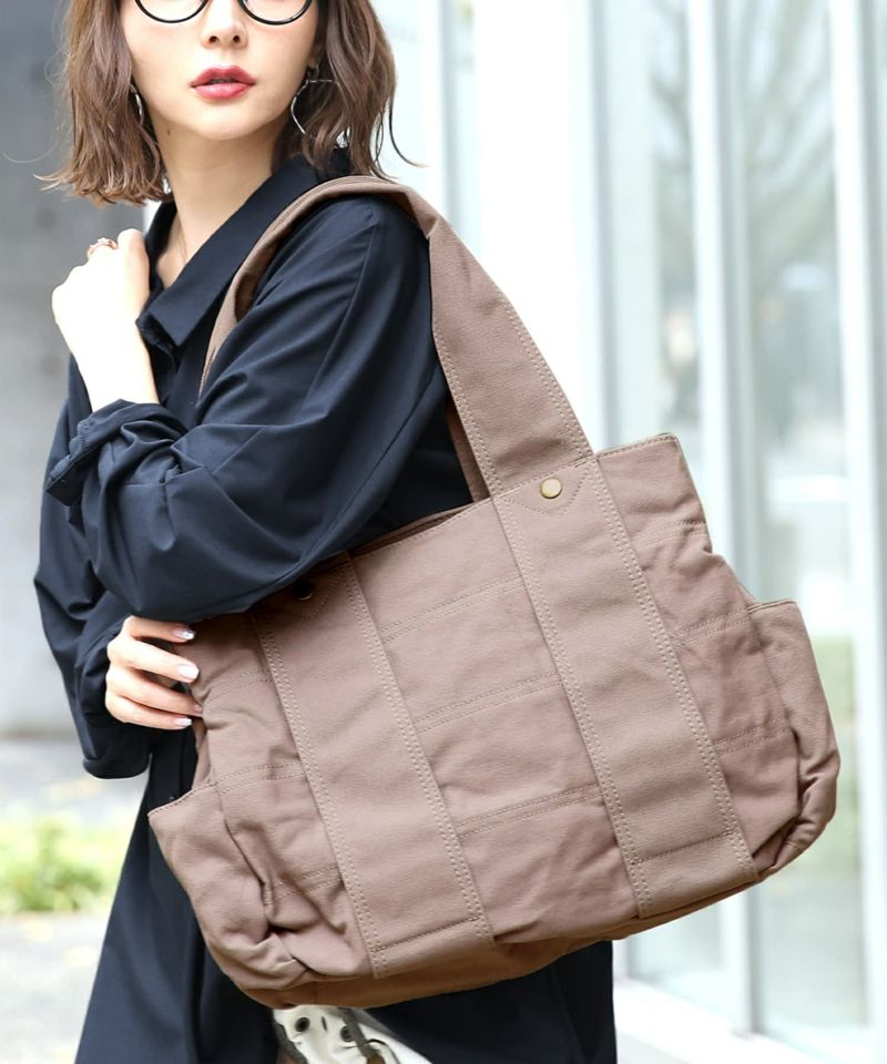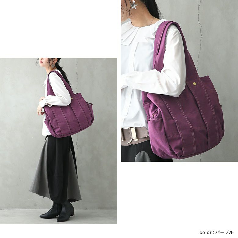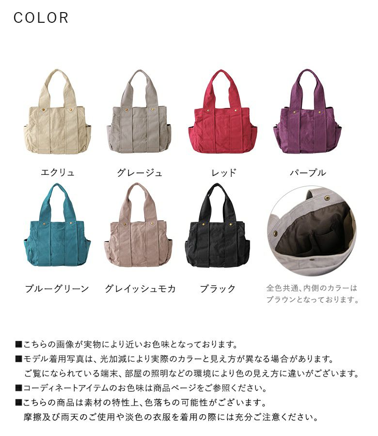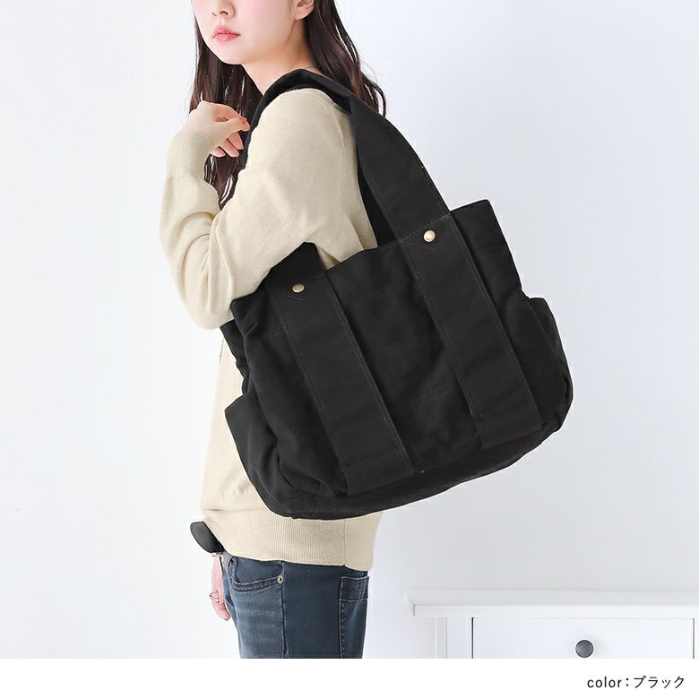 職場にお弁当を持って行くことになりある程度の大きさのバッグを探していました。 ①持ち手がしっかりしているもの ②お弁当箱と水筒を入れてもパンパンにならないもの ③バッグの中に仕切りがあるもの ④キャンパス地であること これが私の希望でしたがなかなか合うものがなく 実は3つ失敗してます(自己嫌悪) で、こちらのバッグを見つけて大きさ等を確認し 購入したのですが、めちゃくちゃいいです!! 持ち手の幅がしっかりあるので肩にかけても 安定感があります。 中も大きな場所とサイドに細かいものが入れられる ポケット、サイドには水筒やキーケースが入るポケット サイドの仕切りにはスマホの入る場所があります。 この大きさだと1泊旅行くらいなら賄えると思います。 色もくすみ系とハッキリ系があるので好みで選べますし 何より大きさが本当に素晴らしい。 大きすぎないので使いやすいです。