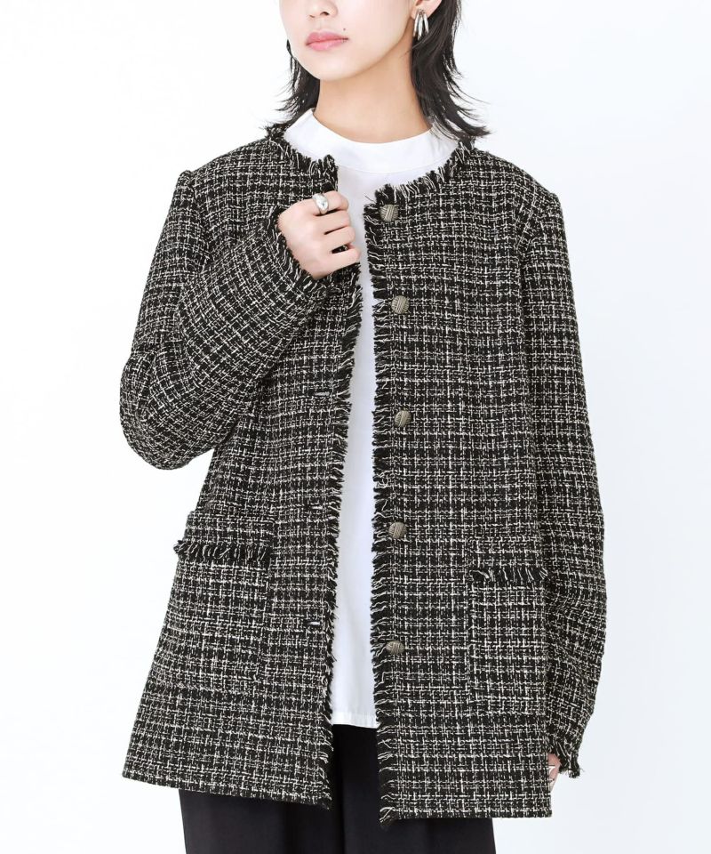 モノトーンでまとめた上品な印象のツイードジャケット。フリンジ使いとヴィンテージ感のあるボタンがアクセントになったデザイン。長め丈のボックスシルエットで旬な着こなしが叶う、セレモニーなど特別なシーンにも着用できるアイテムです。