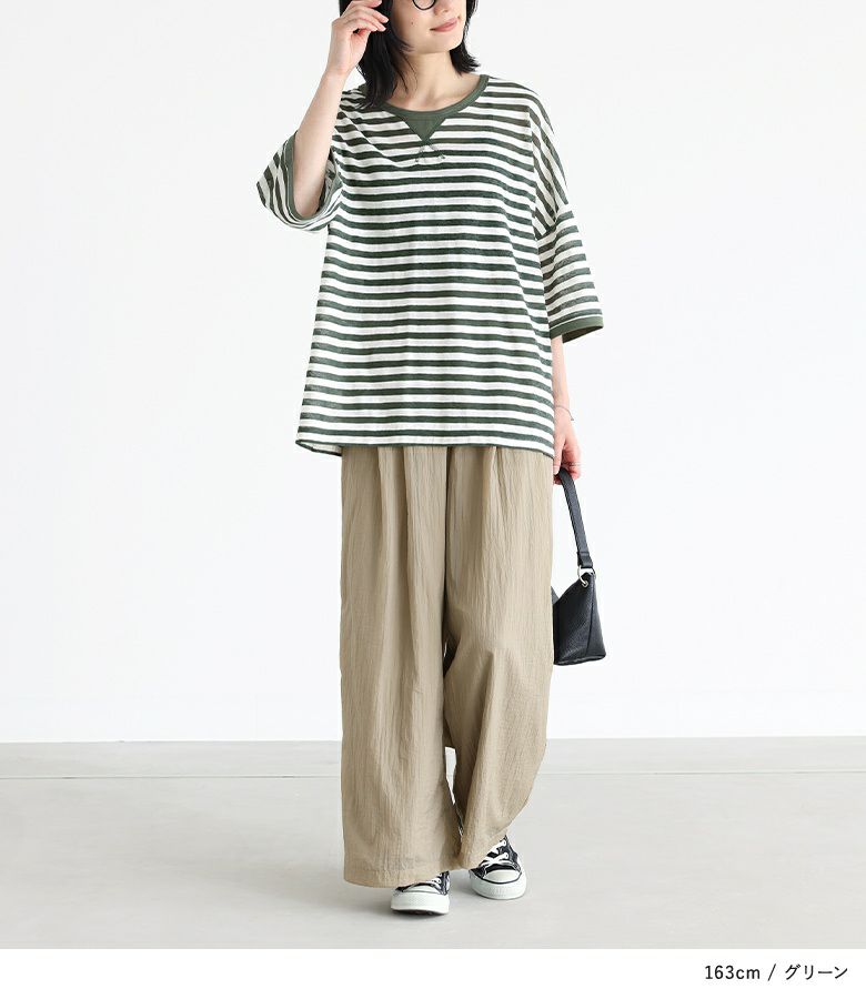 スラブ調でシアー感のあるカットソー生地を使用したボーダー柄トップス。Aラインに広がった袖口がこなれ感を演出します。胸元のV字ガゼットデザインがアクセントになり、表情をプラスします。
