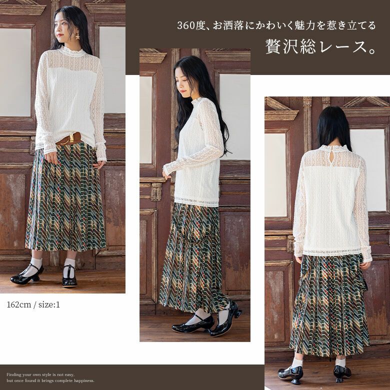 全体に施されたフラワーモチーフの総レースは、伸縮性があり着心地も抜群。袖やデコルテの透け感を楽しめるデザインだから、大人のお洒落女子にぴったりです。