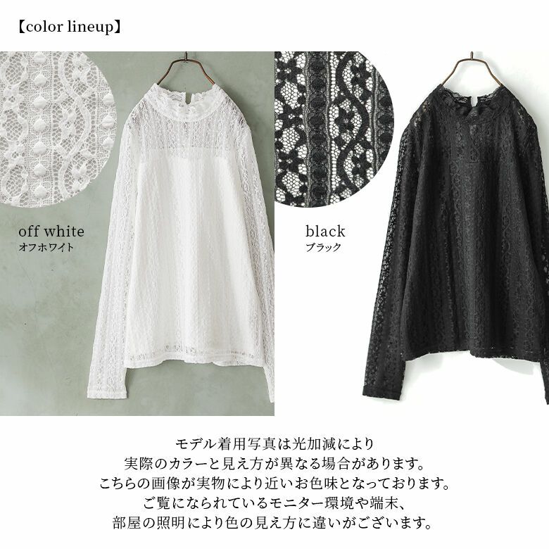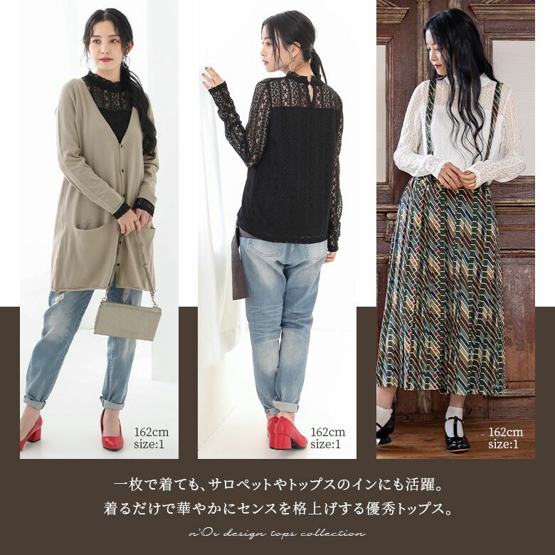 トレンド感あるハイネックデザインが、ピュアでクラシカルな雰囲気を演出する。繊細なレース使いや背面の首元に施されたころんときれいなループボタンなど、360度お洒落見えにこだわったアイテム。一枚で着るのはもちろん、サロペやキャミワンピのインにも使えて色んなコーデを楽しめる優れものです。