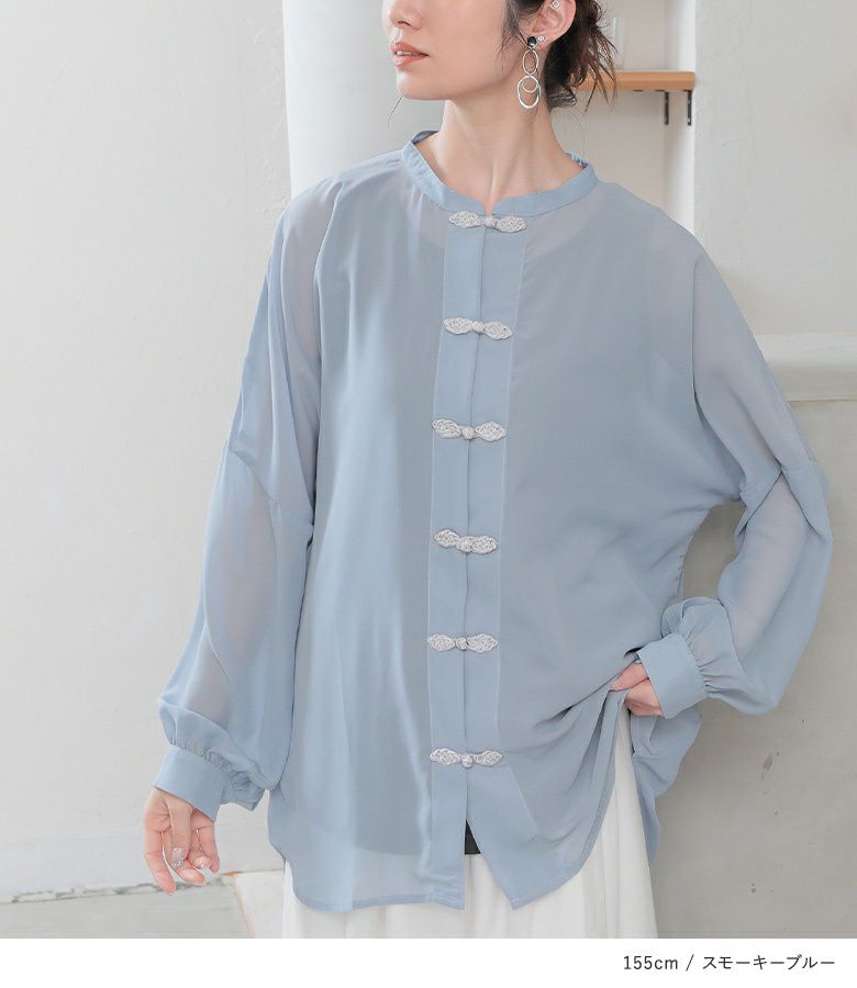 チャイナボタンが目を惹く、シアーブラウス。