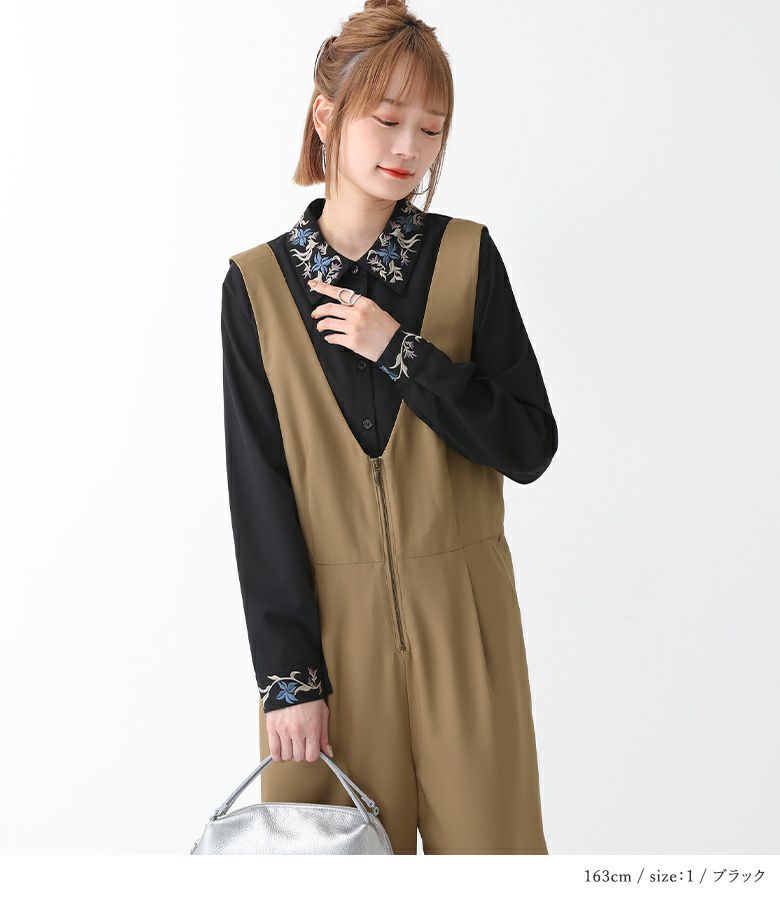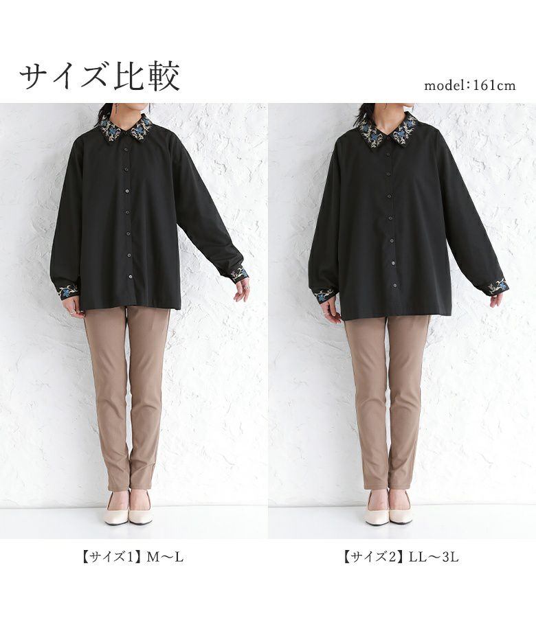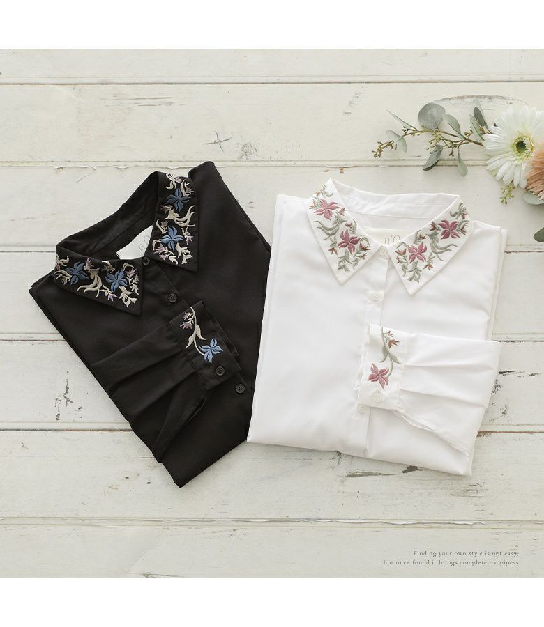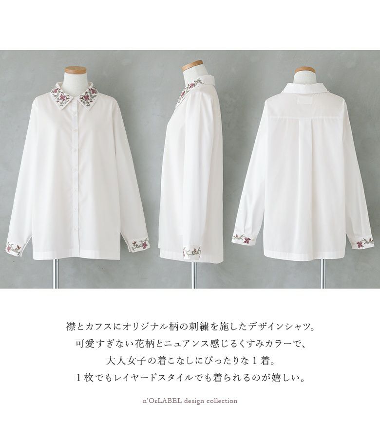 襟とカフスにオリジナル柄の刺繍を施したデザインシャツ。可愛すぎない花柄とニュアンス感じるくすみカラーで、大人女子の着こなしにぴったりな一着。一枚でもレイヤードスタイルでも着られるのが嬉しい。