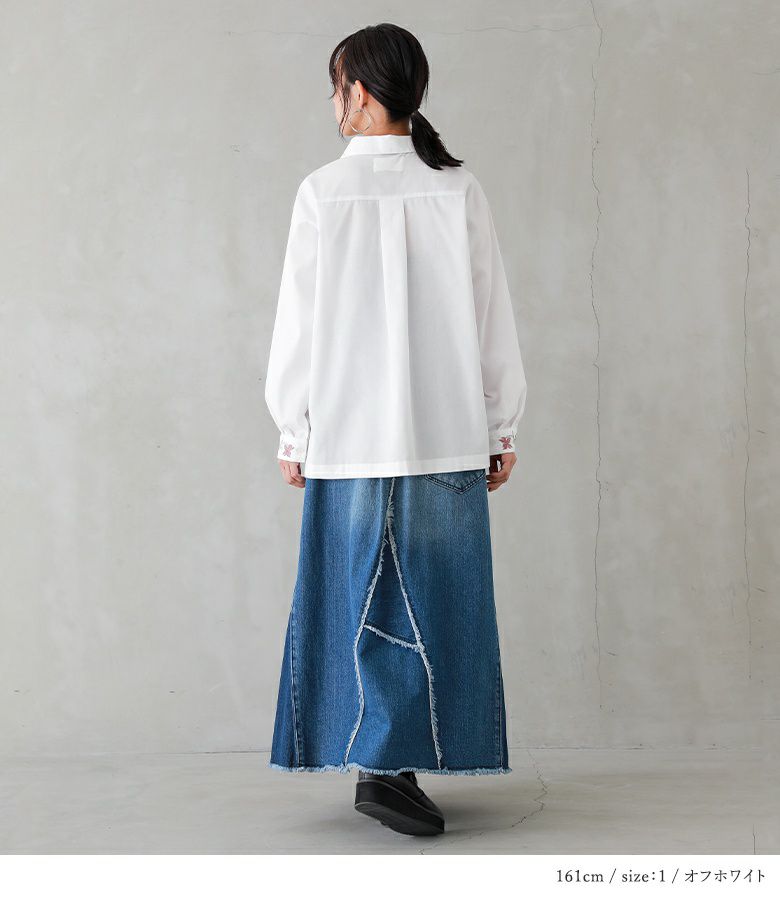 可愛すぎない花柄ニュアンス刺繍シャツ。