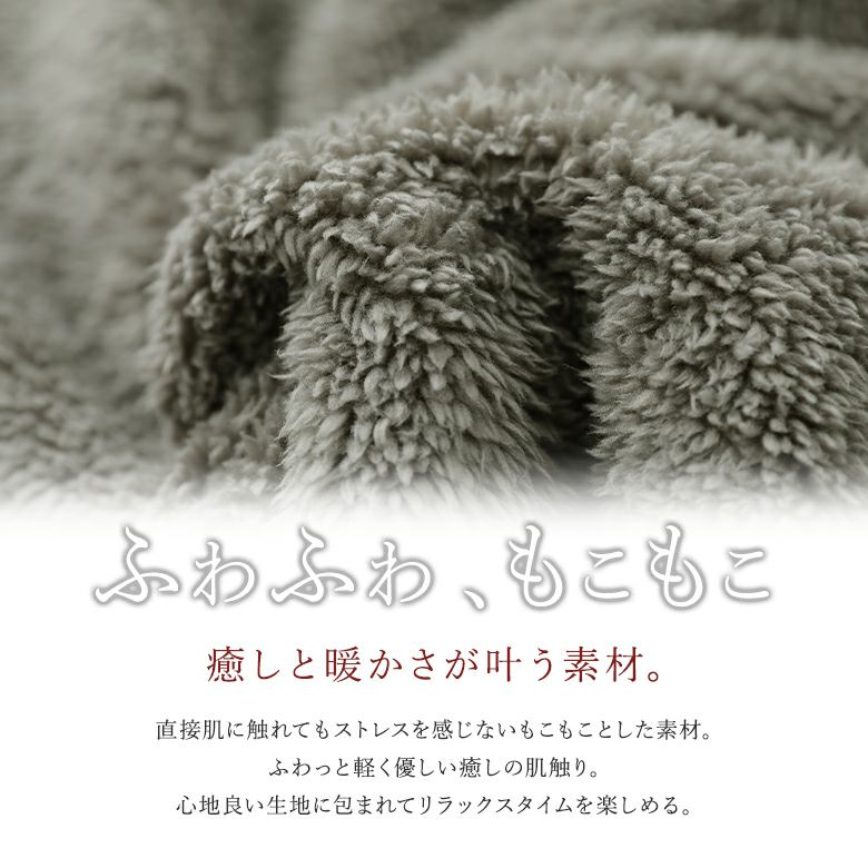 当店の「着る毛布」シリーズは、体に触れてもノンストレスな、軽くて暖かなボア素材が人気の秘密。フワフワで心地よい癒しの肌触りが至福のリラックスタイムを叶えます。