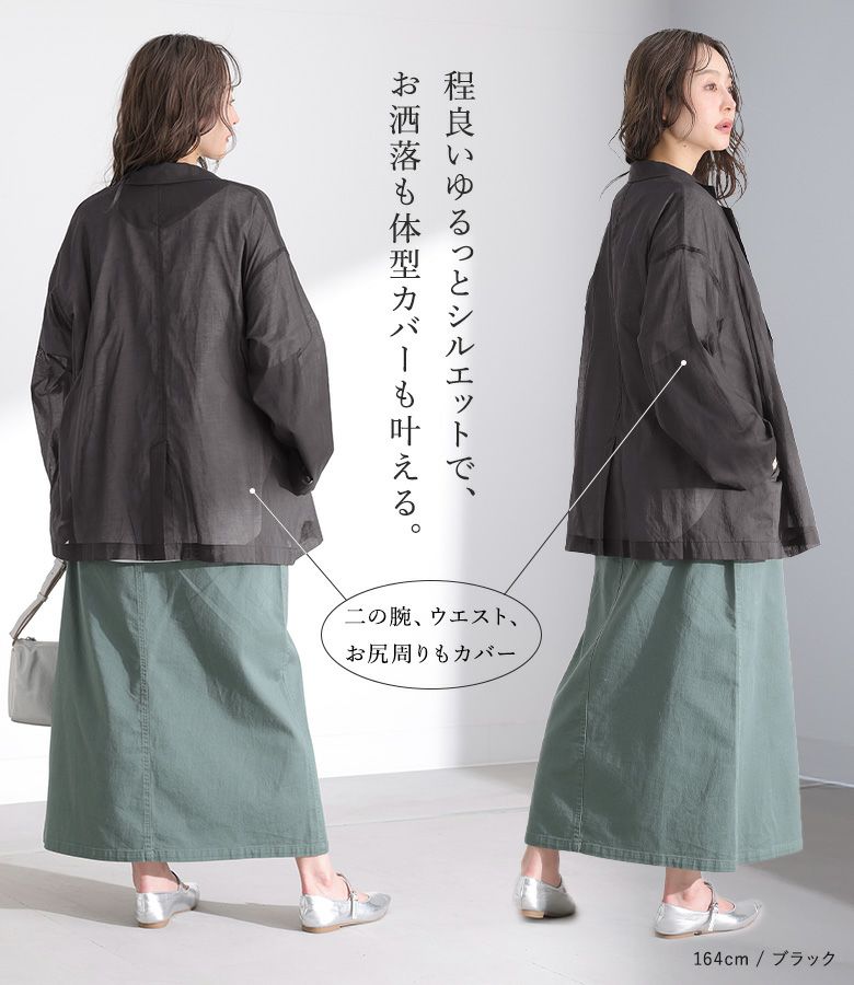 見た目はきちんとしているのに、ブラウスのような軽い着心地でした。お尻まで隠れる着丈なので、体型カバーもできました。