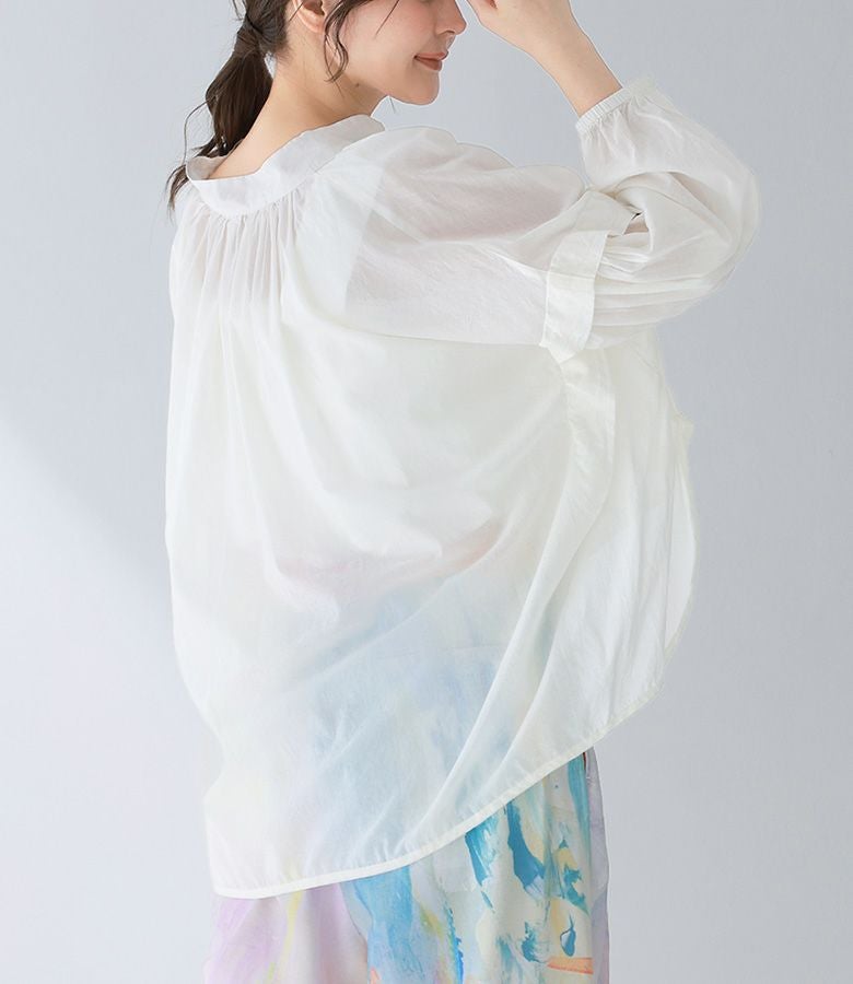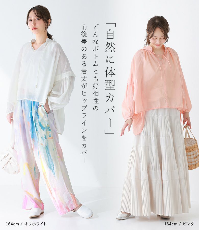 前身頃は腰くらいの着丈、後ろはお尻がすっぽり隠れるので、さっと着るだけで抜け感が出ます。透けすぎないシアー感でした。