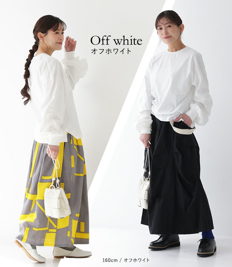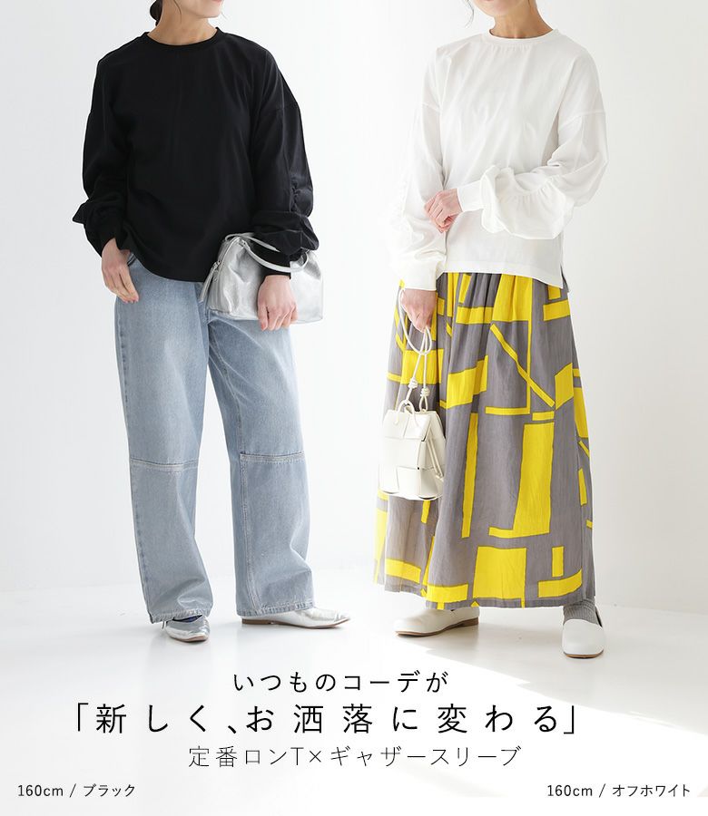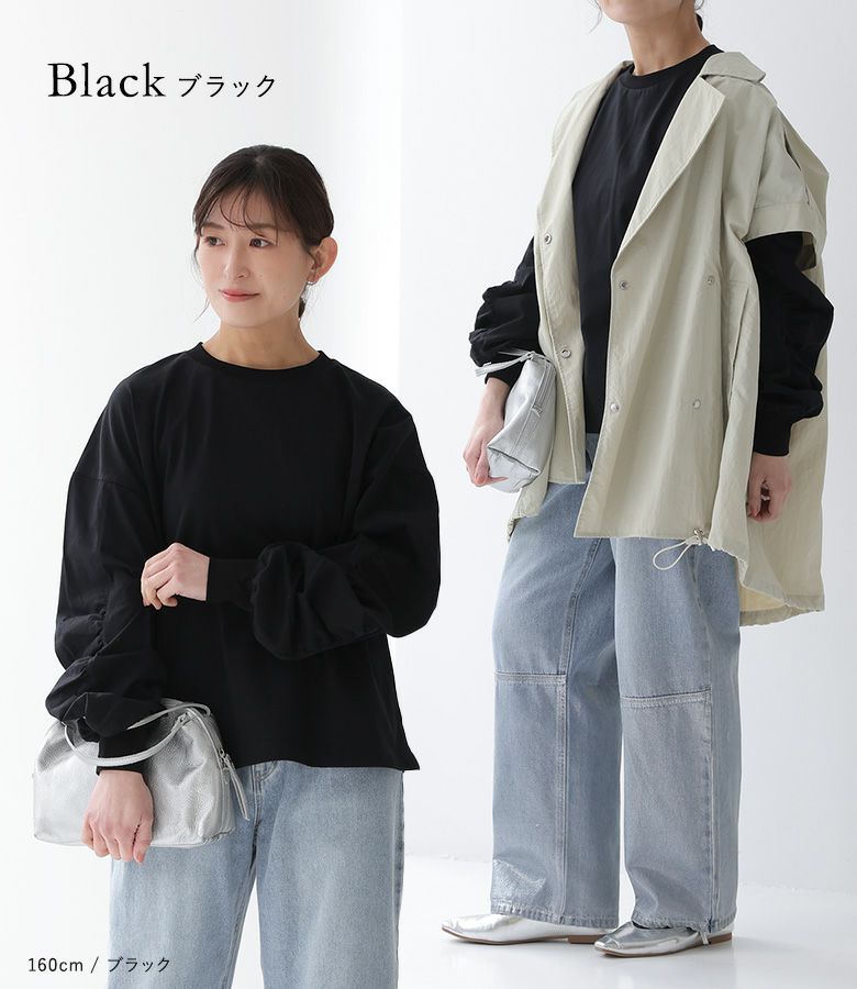 袖を通すだけで、袖部分のギャザーがキレイに出ました。ワイドめなボトムスともバランスが取りやすい着丈でした。