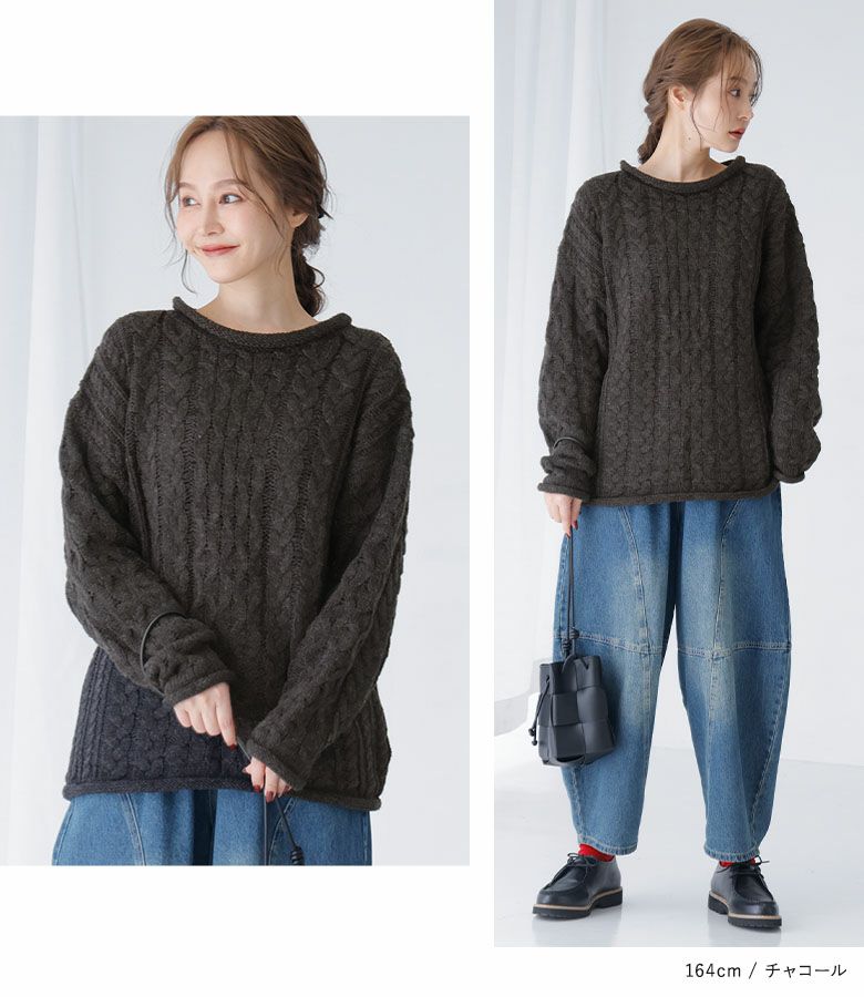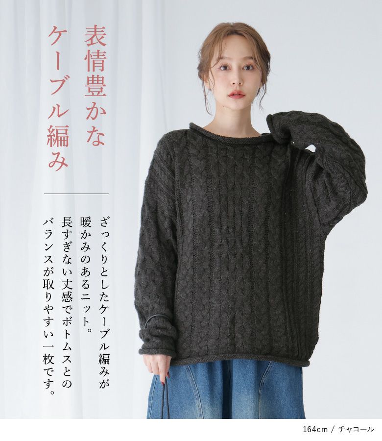 全体的にゆとりのあるサイズ感で着用できました。ケーブル編みデザインが素敵なニットです♪