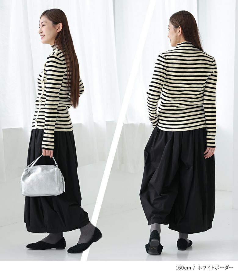 リブ素材が体に沿うシルエットで、伸縮性があるので楽な着心地です。ボトルネックは首周りのしめつけ感がなく着用できました。