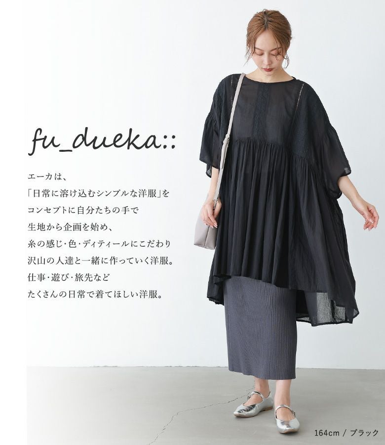 エーカは、「日常に溶け込むシンプルな洋服」をコンセプトに自分たちの手で生地から企画を始め、糸の感じ・色・ディティールにこだわり沢山の人達と一緒に作っていく洋服。