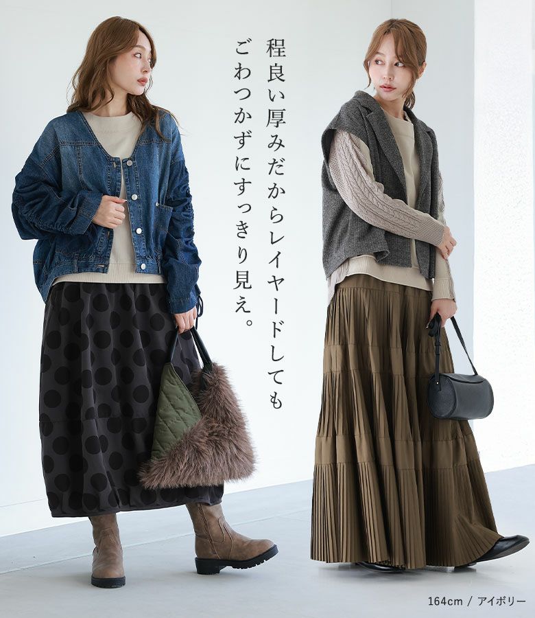 ボトムスとのバランスが良いです。二の腕やお腹周りは体型カバーもできるので嬉しいです。