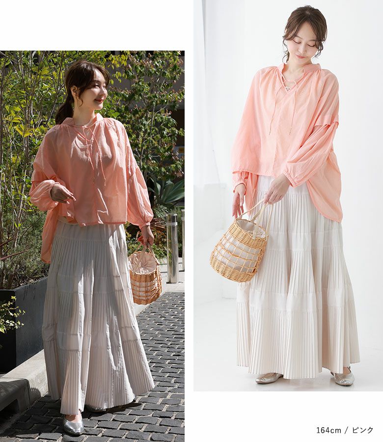 前身頃は腰くらいの着丈、後ろはお尻がすっぽり隠れるので、さっと着るだけで抜け感が出ます。透けすぎないシアー感でした。