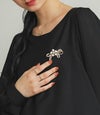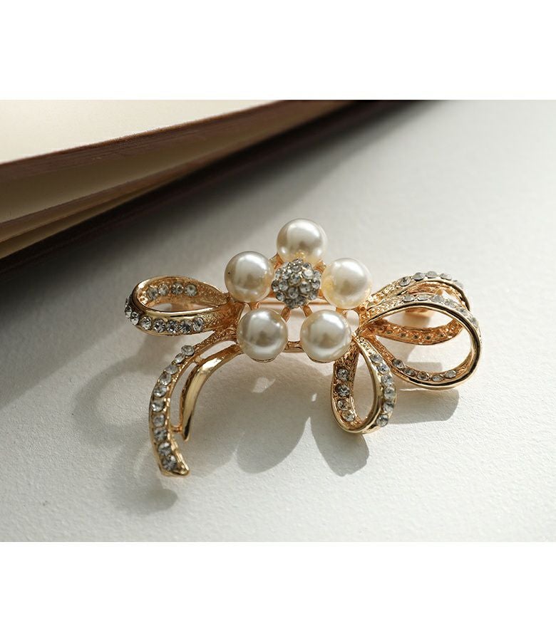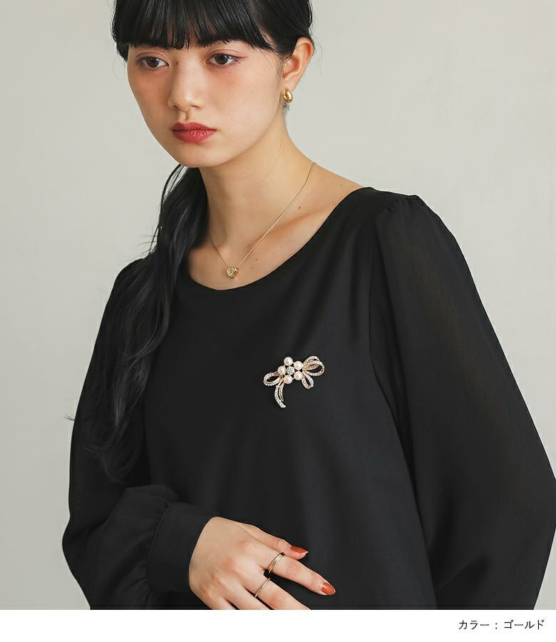 胸元をさりげなく彩るリボンブローチ。