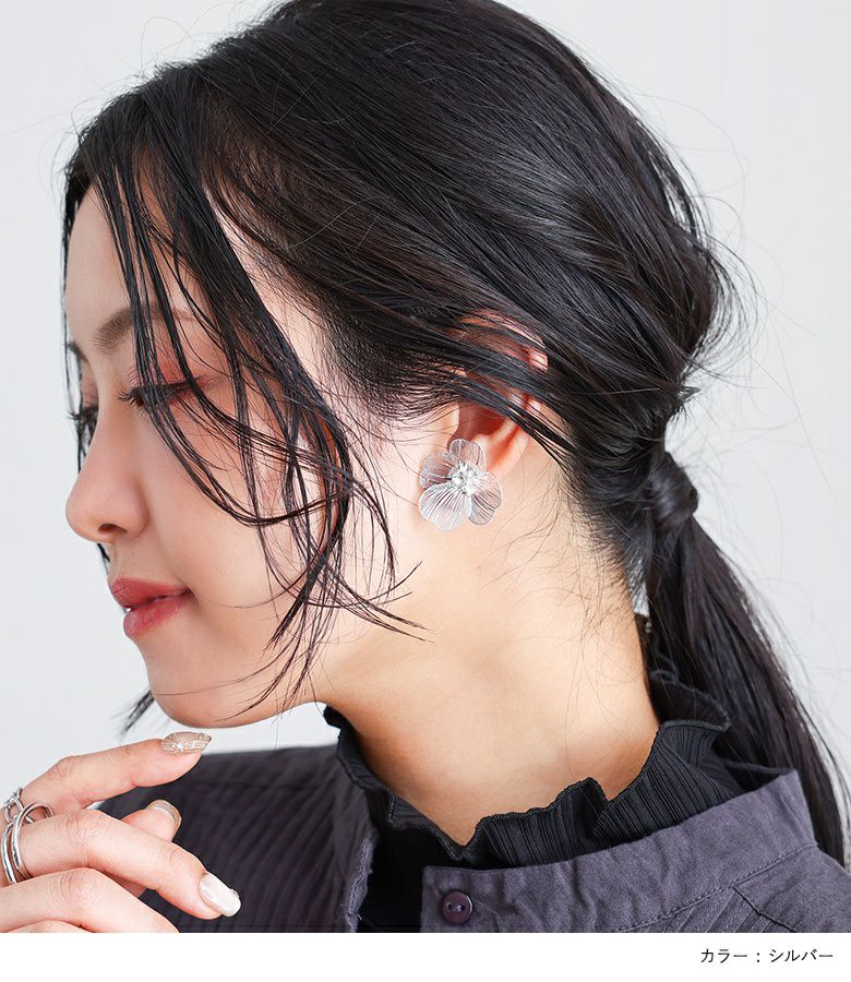 顔周りに華やかさをプラスするフラワーモチーフイヤリング。
