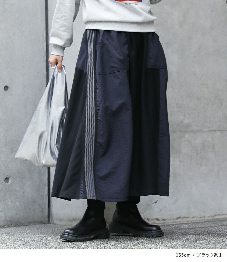異素材のパッチワークでリメイクしたようなデザインのトラックスカート。モードにもカジュアルにも使えて、ウエストはヒモで調整できるので楽ちんな穿き心地です。グレージュ・ブラック系1と、杢グレー・ブラックは異なるデザインです。