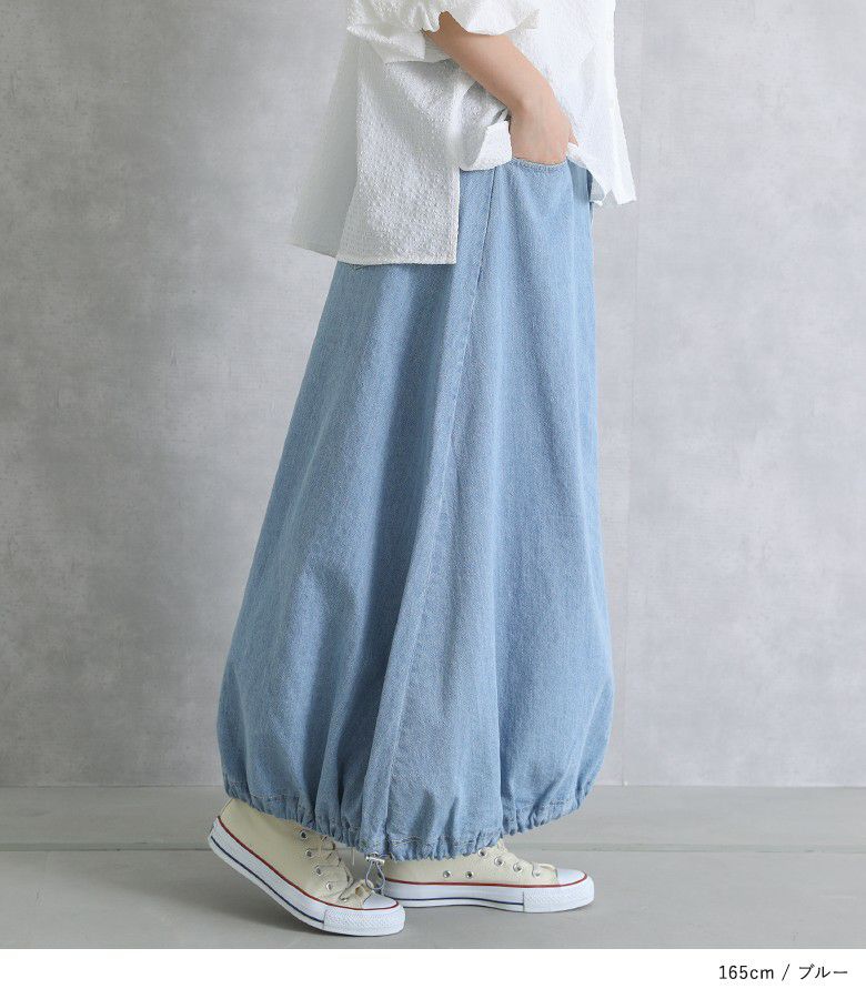 裾のドロストでお好みのシルエットに調整が可能なデニムスカート。