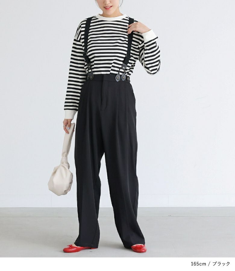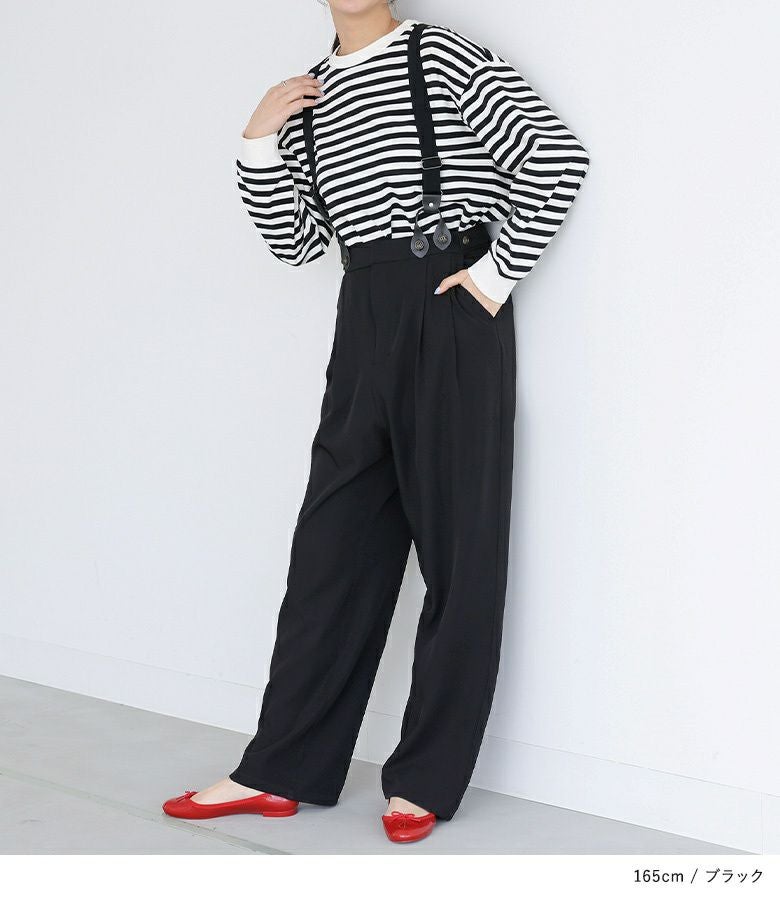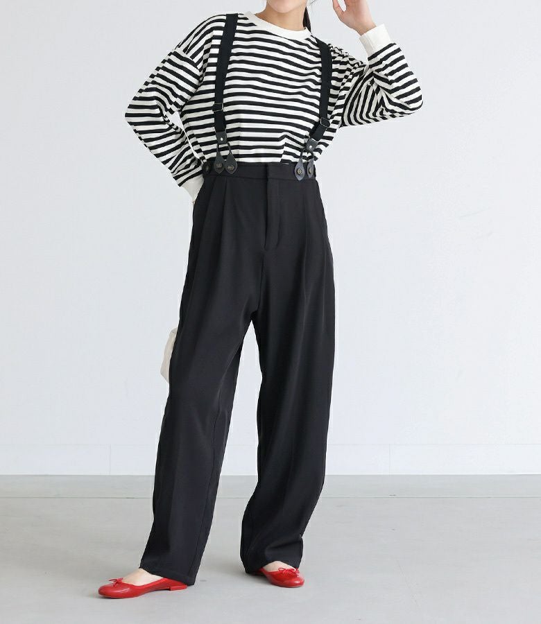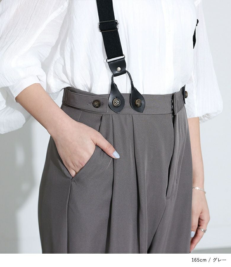 取り外し可能なサスペンダーが付いたパンツ。ワンタック入りでスッキリとしたシルエットに見せてくれます。両サイドボタンでさりげなくアクセントをプラスできるのも嬉しいポイント。