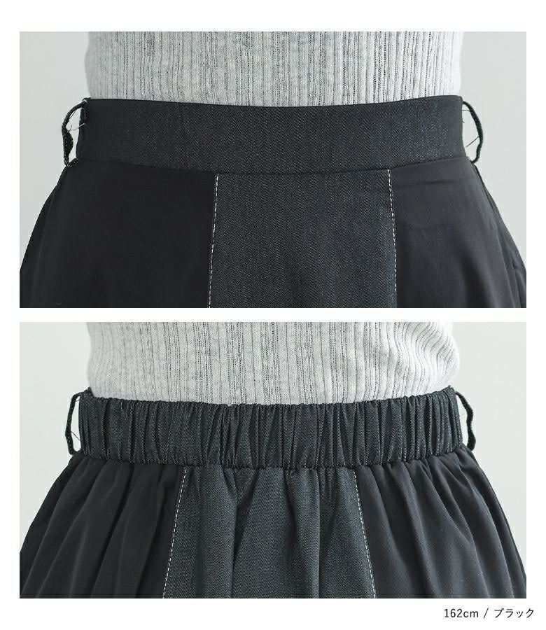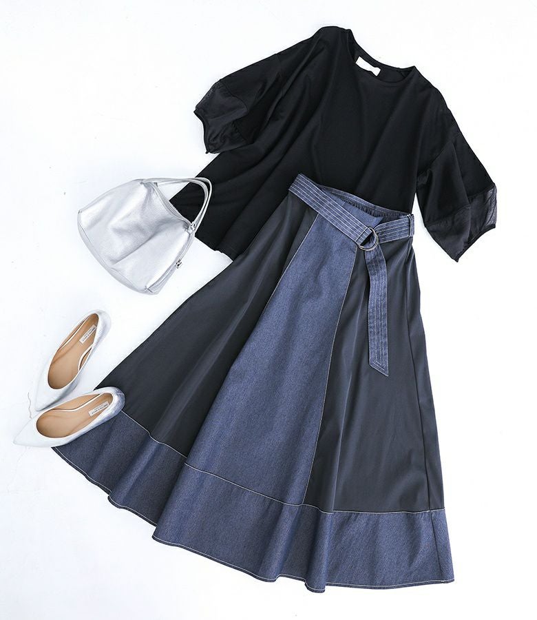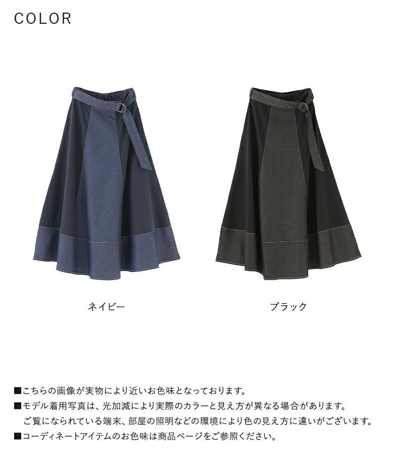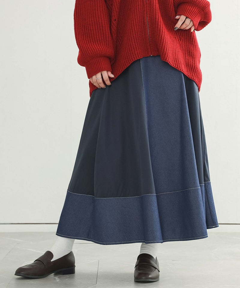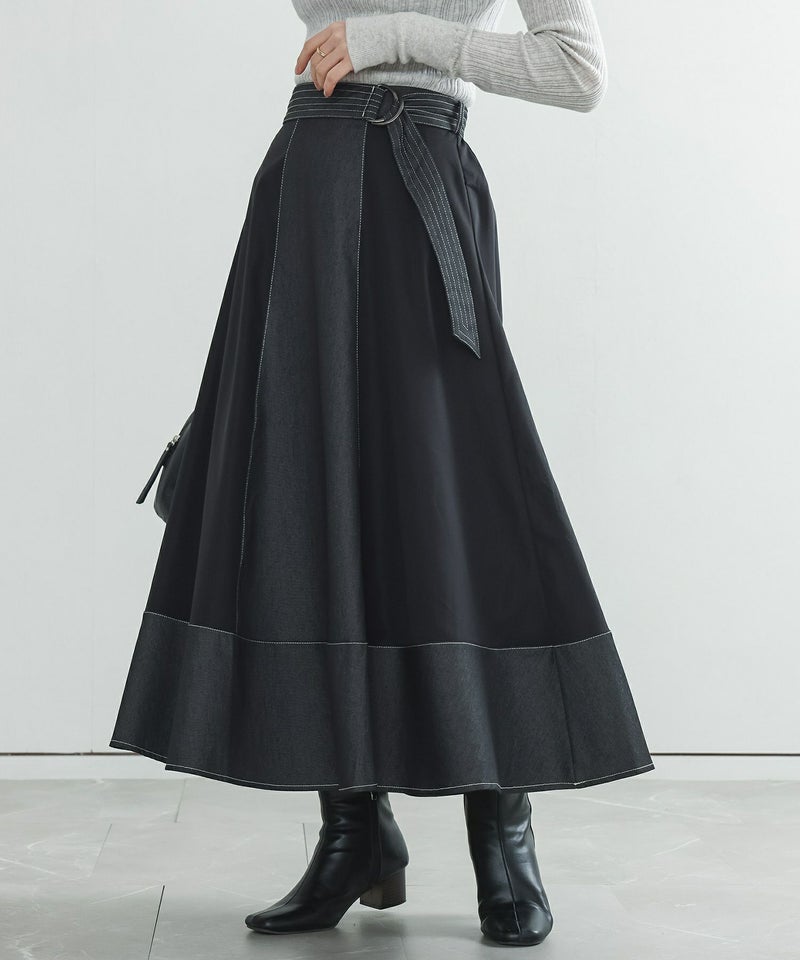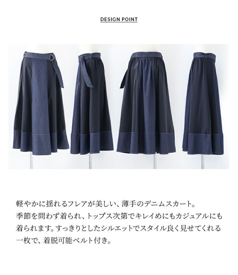 軽やかに揺れるフレアが美しい異素材デニム切替スカート。