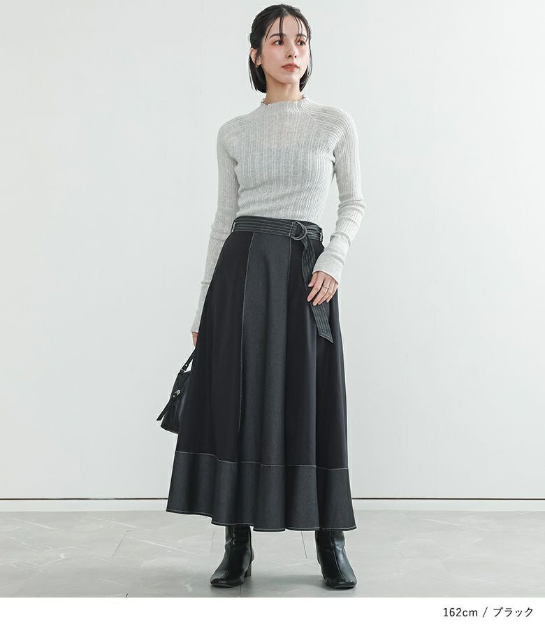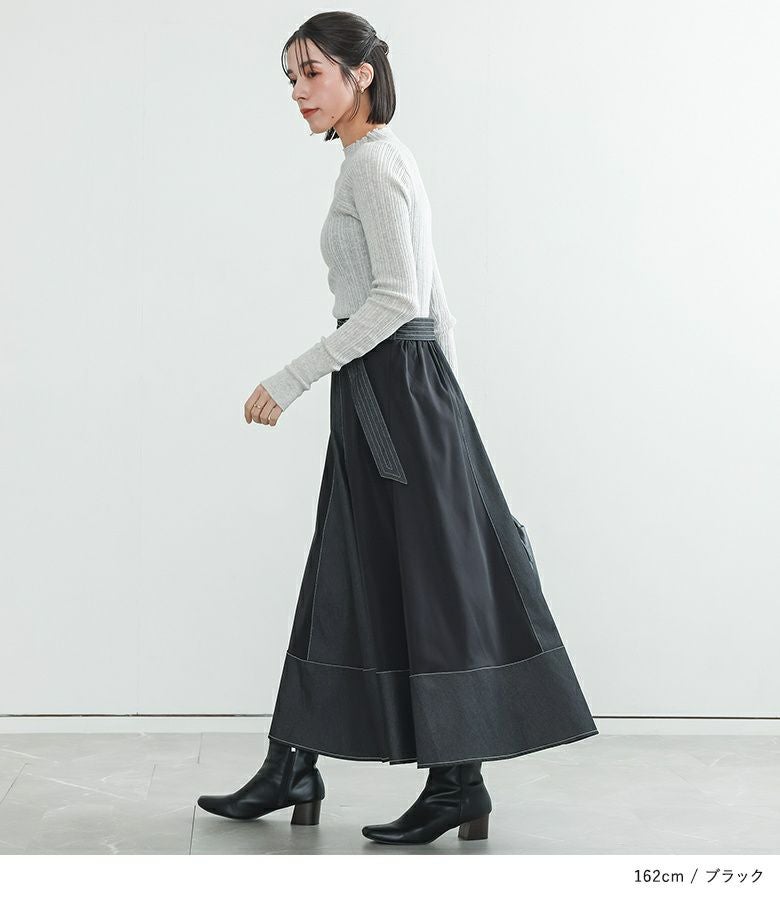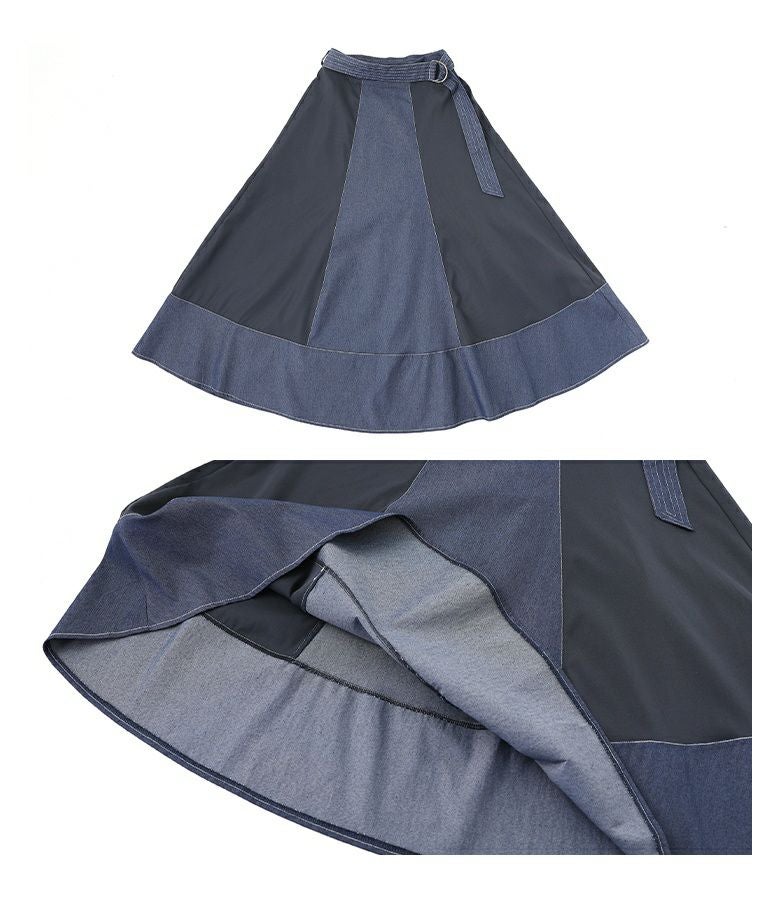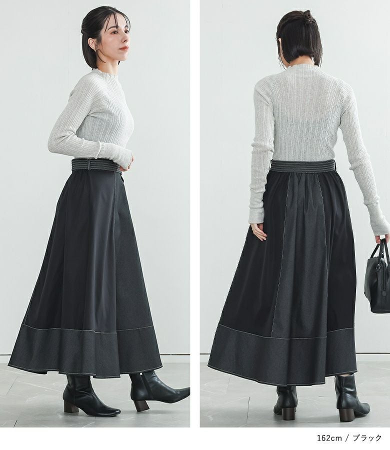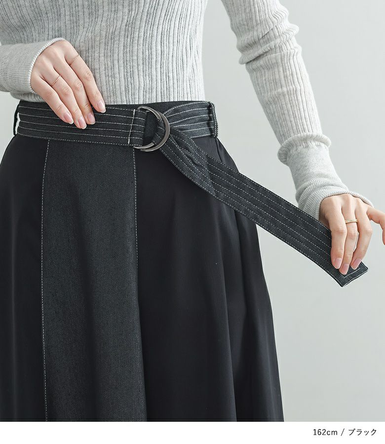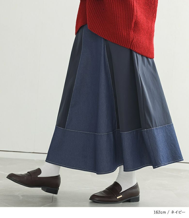 軽やかに揺れるフレアが美しい異素材デニム切替スカート。