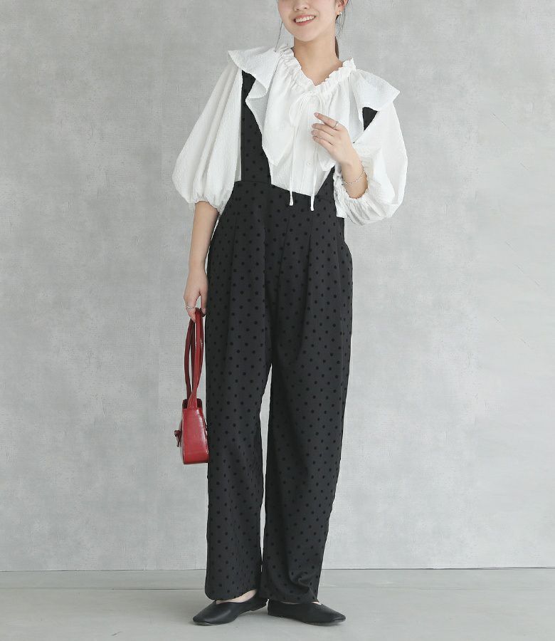 上品なドット柄が大人のカジュアルスタイルを格上げするデザインサロペット。