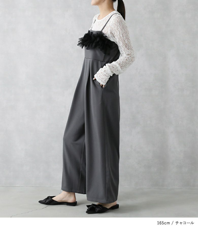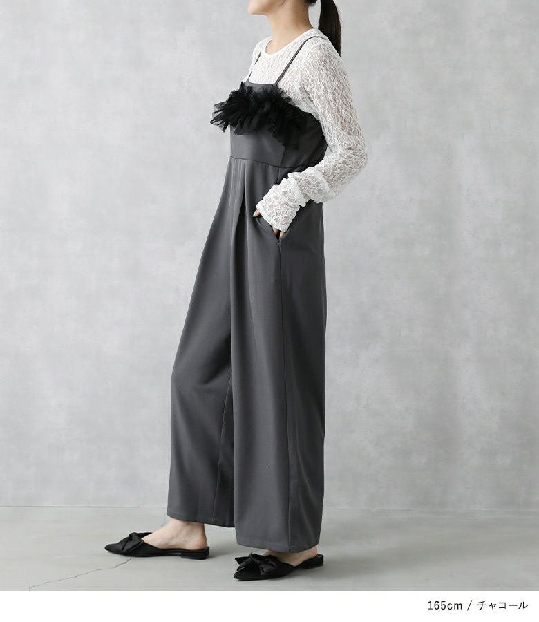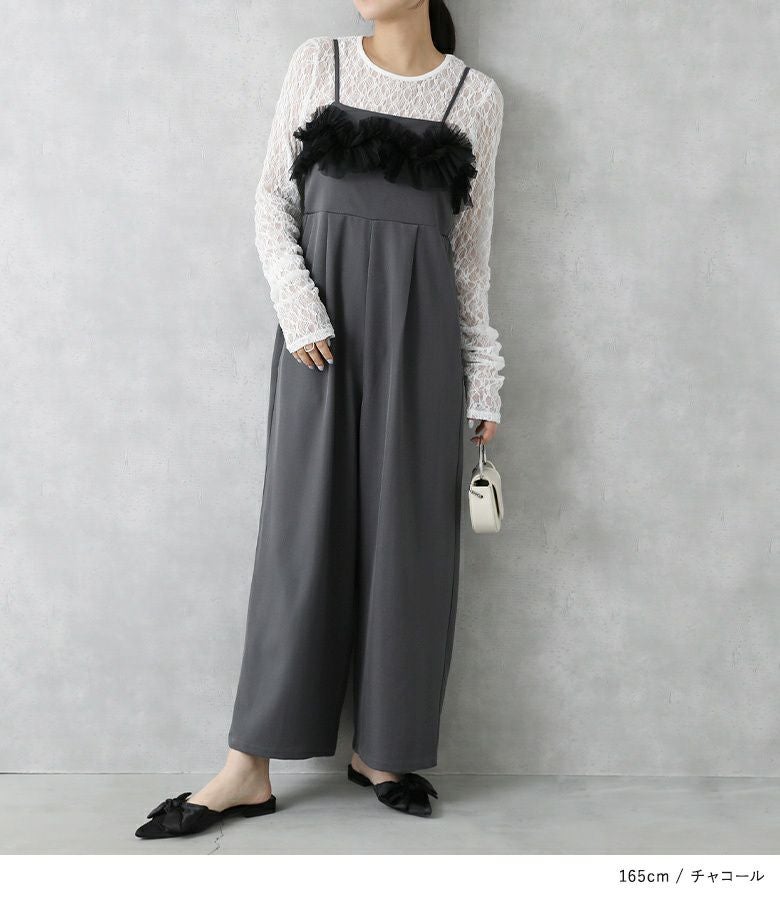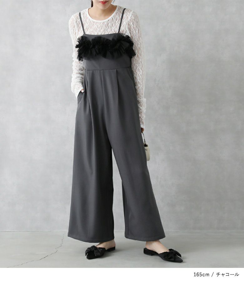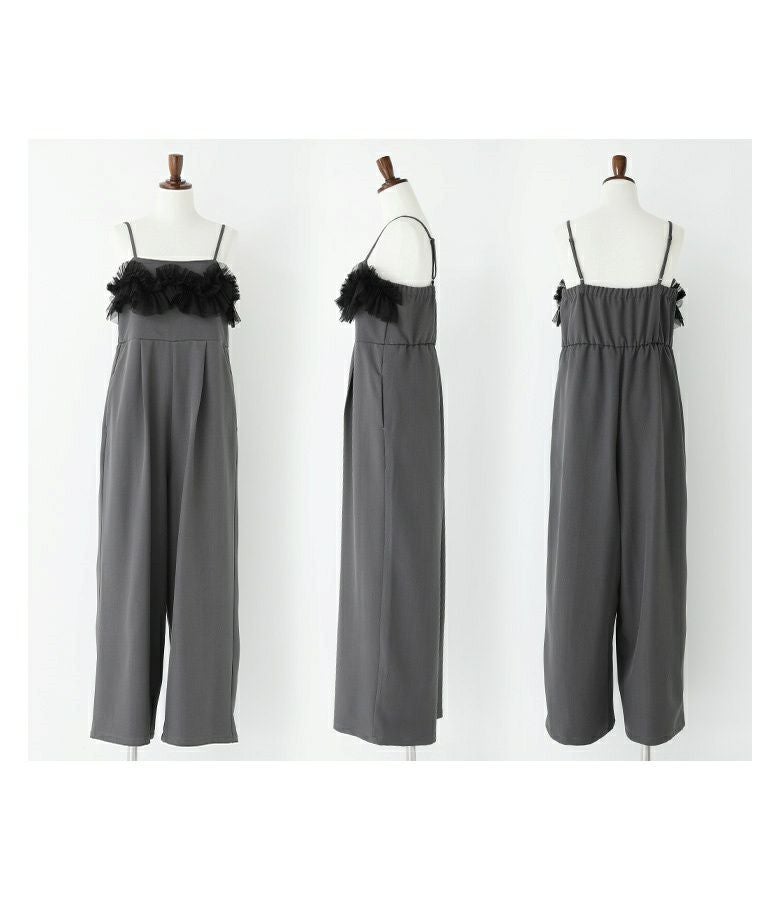 胸元にチュールフリルがドッキングされたオールインワン。華やかさがありながらも、シックなカラーで甘くなりすぎず、洗練された印象をプラスできる一枚です。