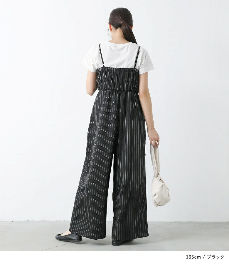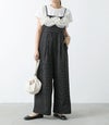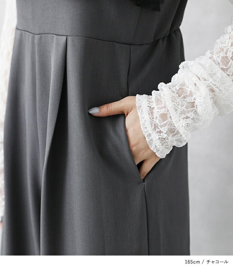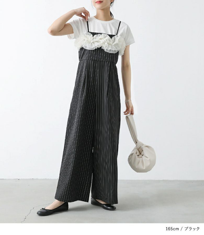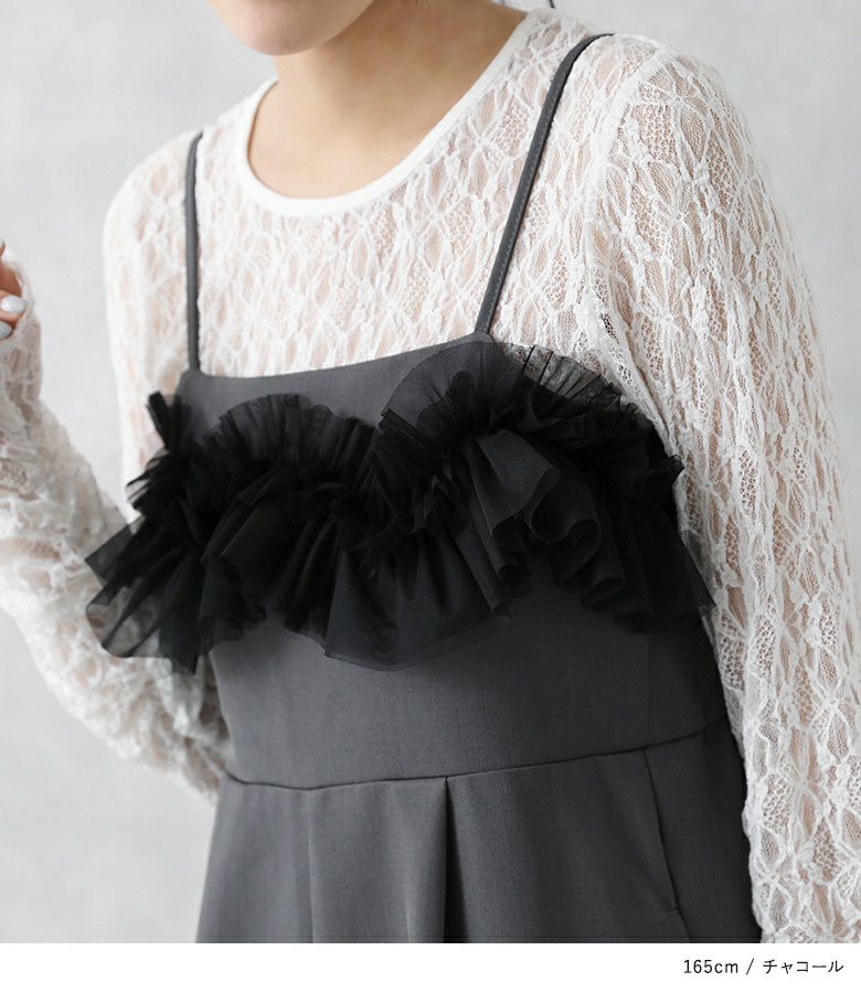胸元にチュールフリルがドッキングされたオールインワン。華やかさがありながらも、シックなカラーで甘くなりすぎず、洗練された印象をプラスできる一枚です。