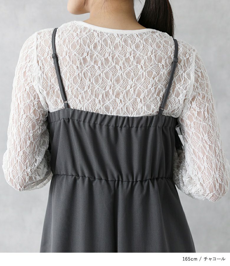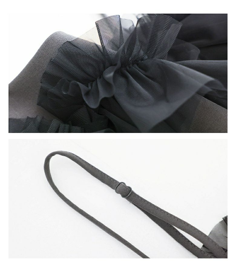 さらりとした肌触りのポリエステル素材を使用。チュール部分には、シアー素材を使用し抜け感をプラスしています。程よい厚みのため、合わせるインナー次第でロングシーズンご着用いただけます。