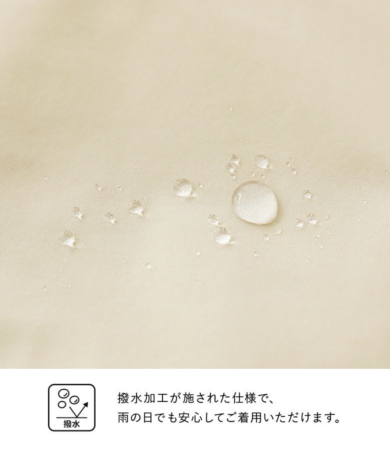 シャカシャカとした質感でサラッとした肌触りのポリエステル生地。撥水加工で雨の日やお出かけにも使いやすい素材です。
