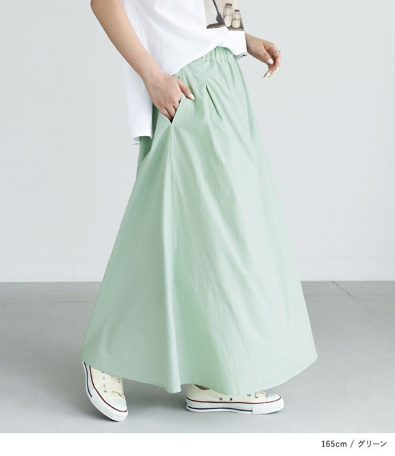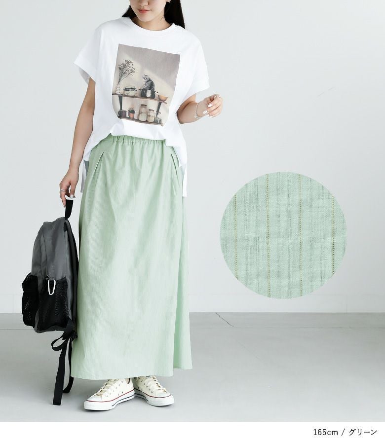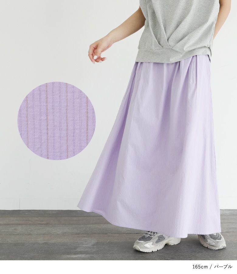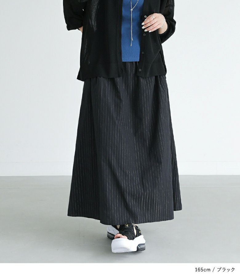 細めのゴールドストライプで縦のシルエットを強調してくれるスカート。ギャザーで立体的なシルエットを作り出し、コーデに存在感をプラスしてくれます。ウエストゴム仕様で楽に着用できるのも嬉しいポイント。