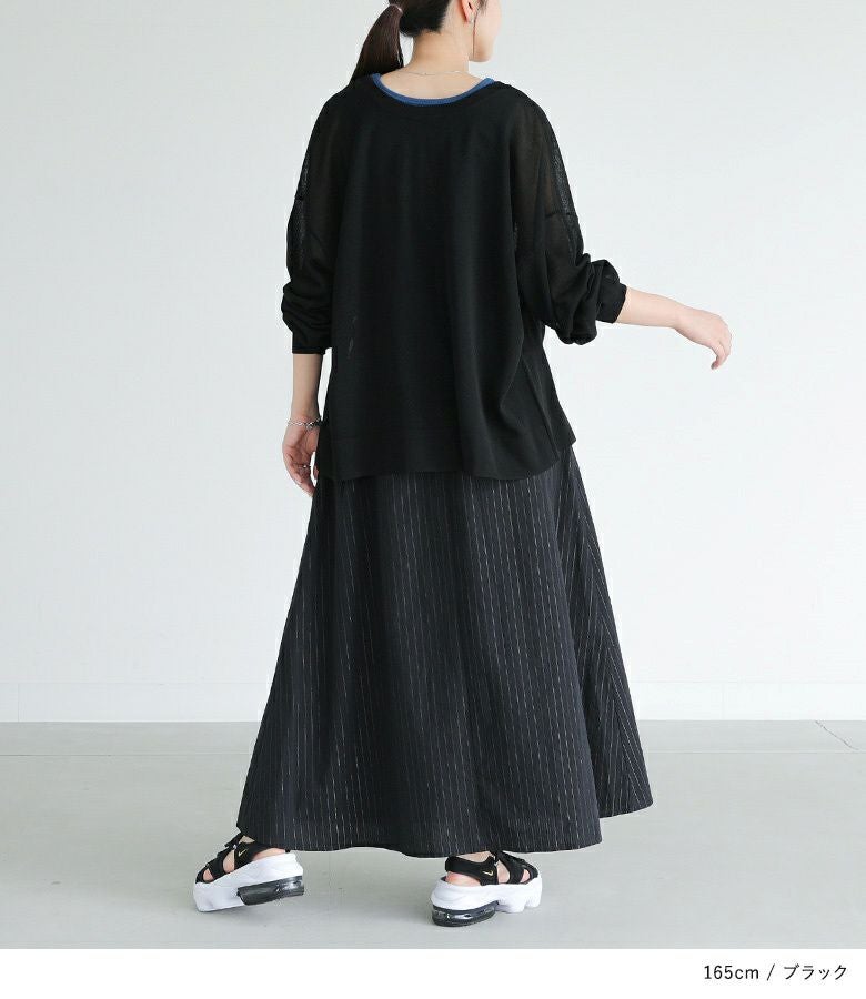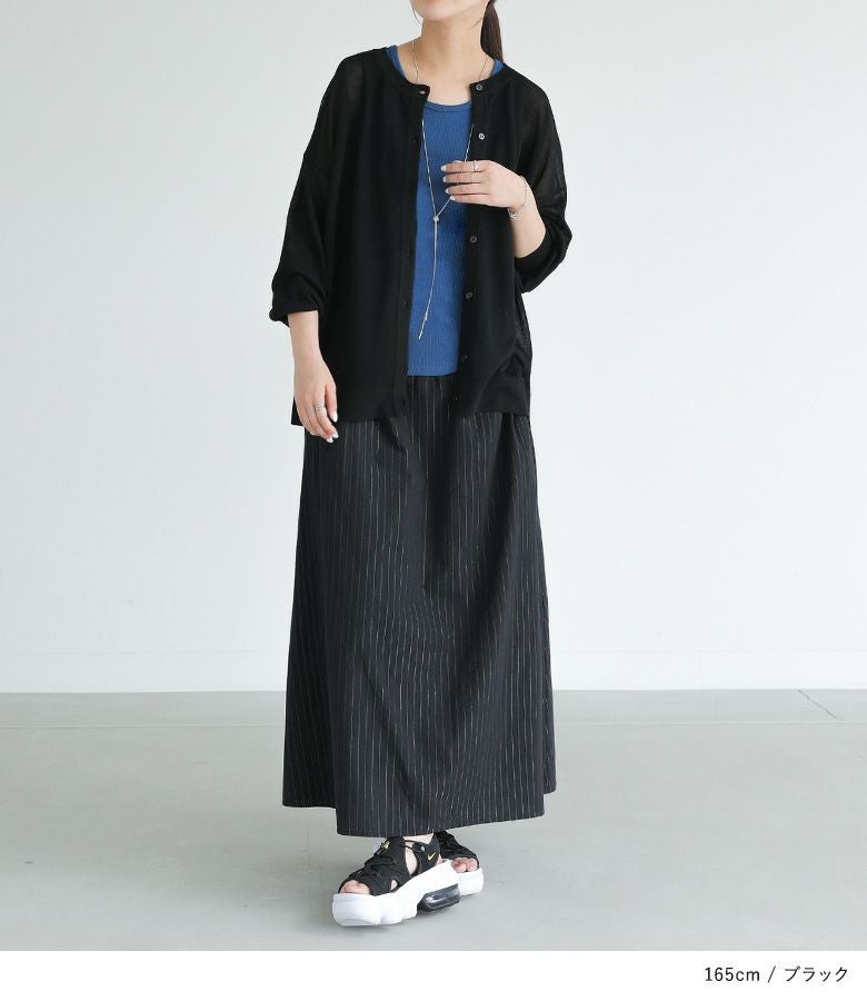 細めのゴールドストライプで縦のシルエットを強調してくれるスカート。