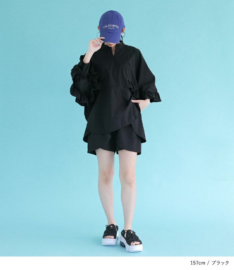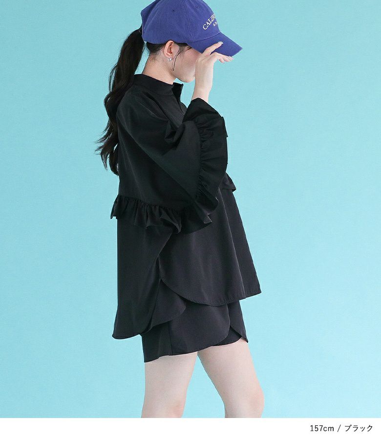 スポーティーになりがちなビーチでも大人かわいいスタイルが叶うラッシュガード。ウエストゴム仕様になっており、ラクな着心地を叶えます。2段重ねになったフリルデザインでお尻周りのラインをぼかしてくれるのもポイント。